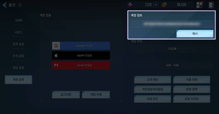 게임 내 옵션에서 회원 번호 복사 가능.