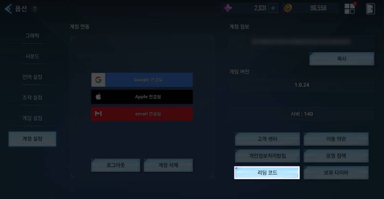 2. [계정] - [리딤 코드] 선택합니다.