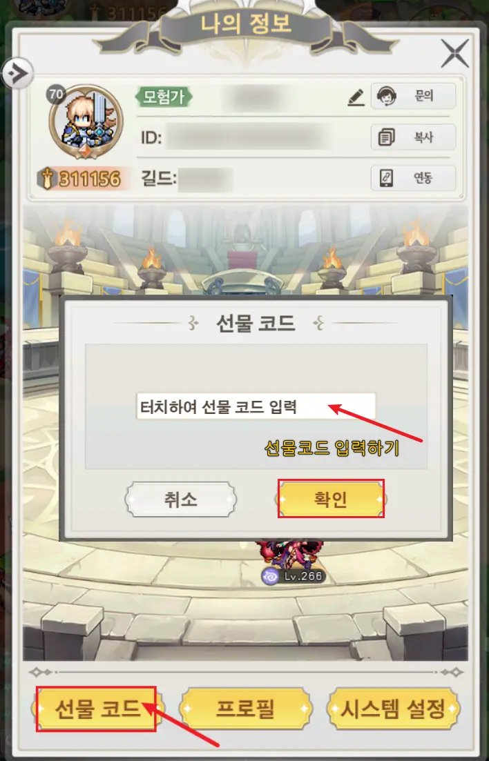 2. [선물코드] 클릭 후 위와 같이 입력.