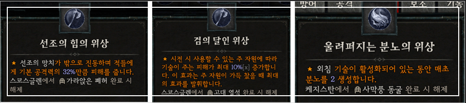 전설 위상으로는 선망빌드에 가장 잘 어울리는 [선조의 힘의 위상]을 기본으로, 분노가 찼을 때 데미지를 올려주는 검의 달인, 외침을 썼을 때 매초 분노를 수급하는 [울려퍼지는 분노의 위상]을 추천드립니다.