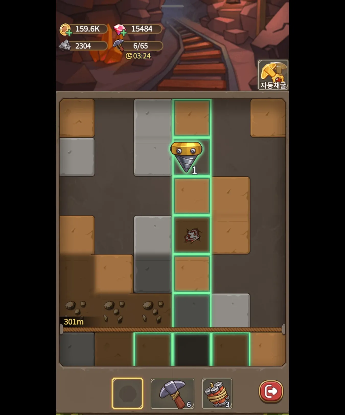 광산에서는 곡괭이, 드릴, 폭탄으로 채굴 가능.