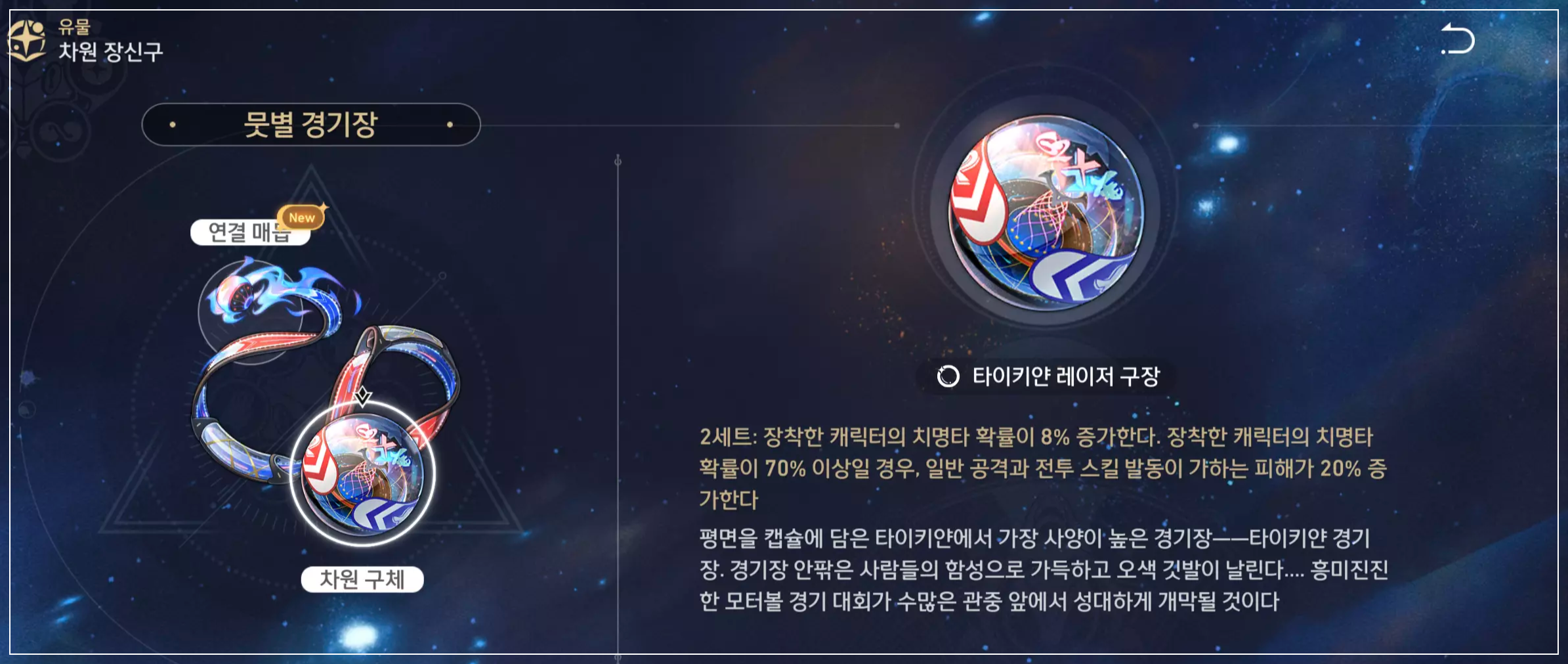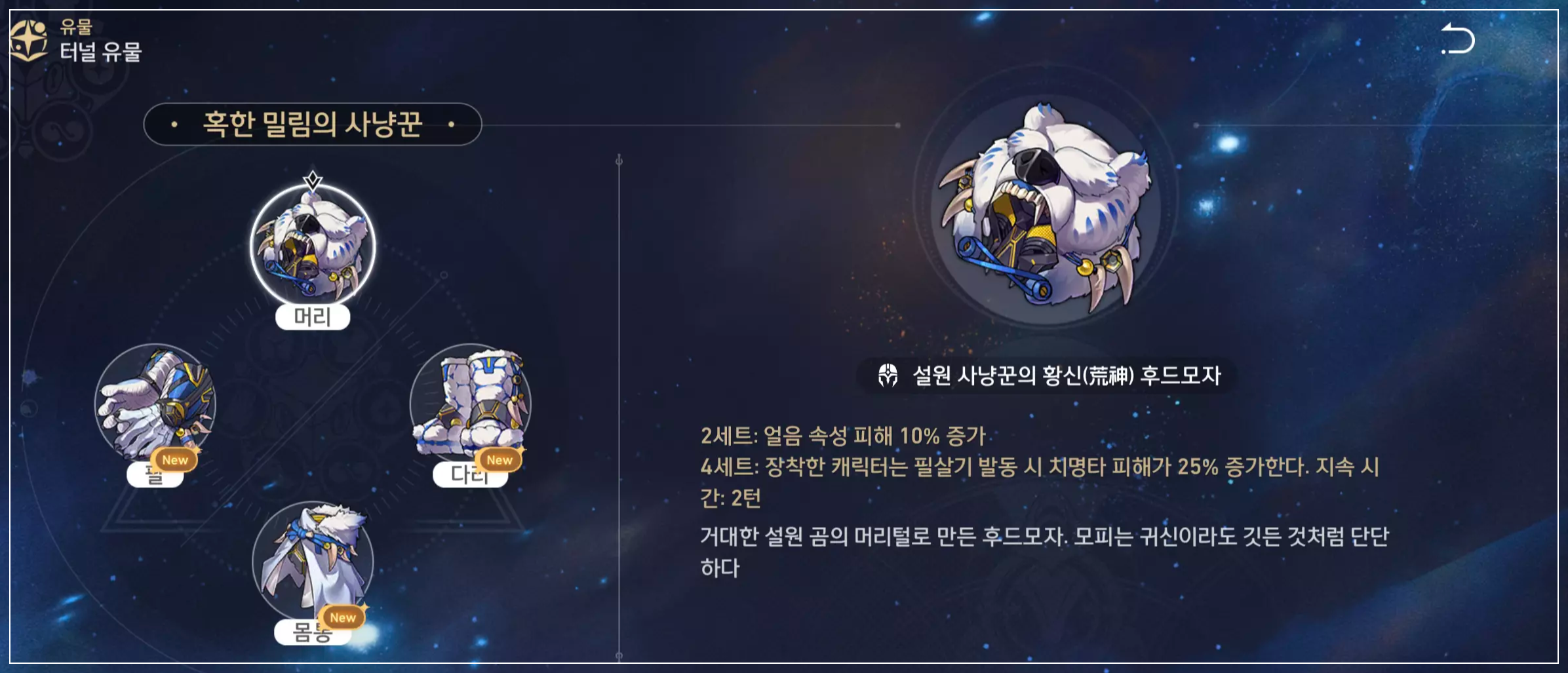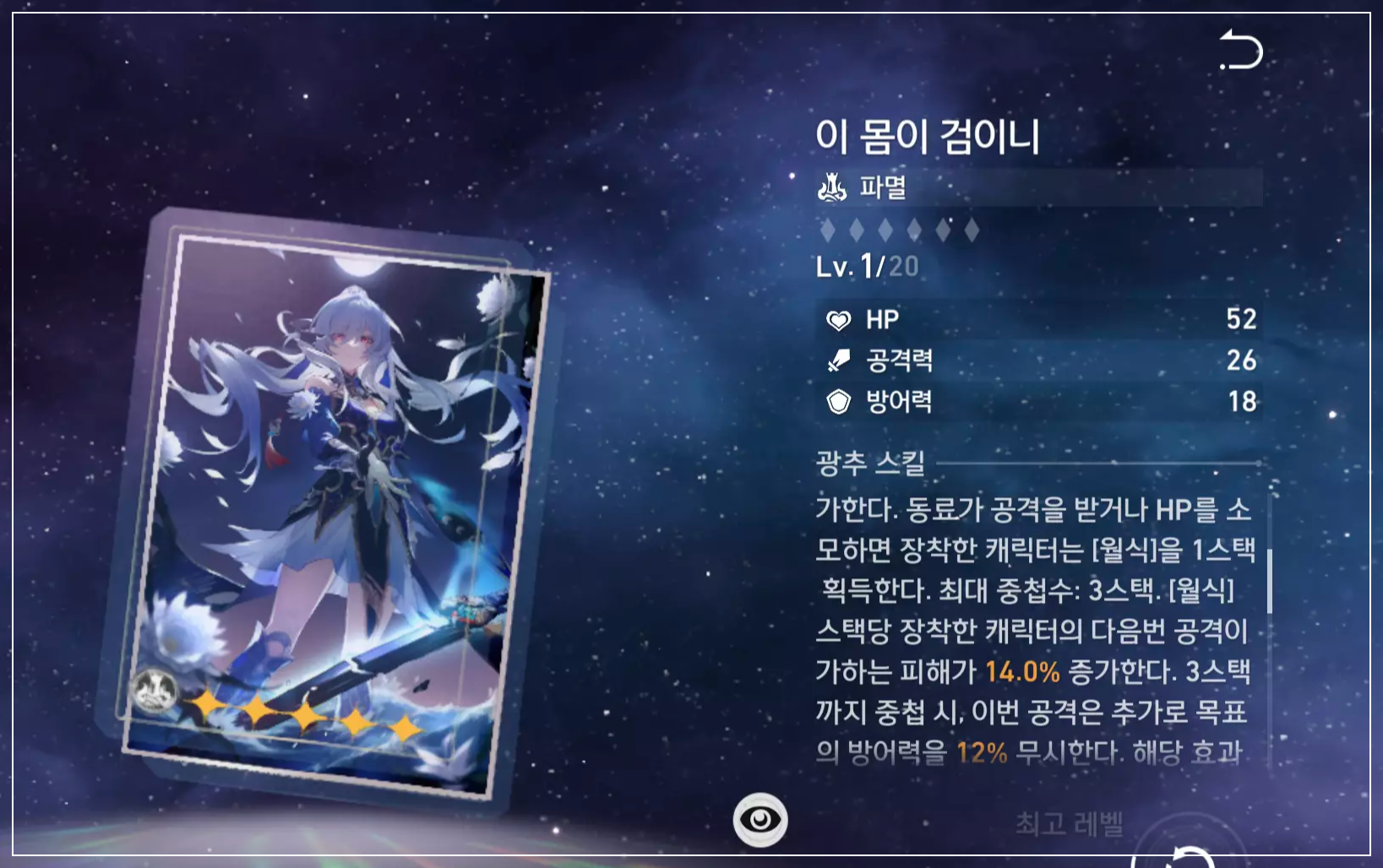 | 부 옵션 | 1 순위 : 치명타 확률 2 순위 : 치명타 피해 3 순위 : HP% 4 순위 : 속도 |