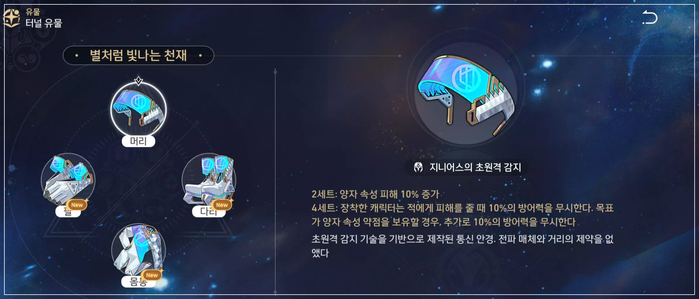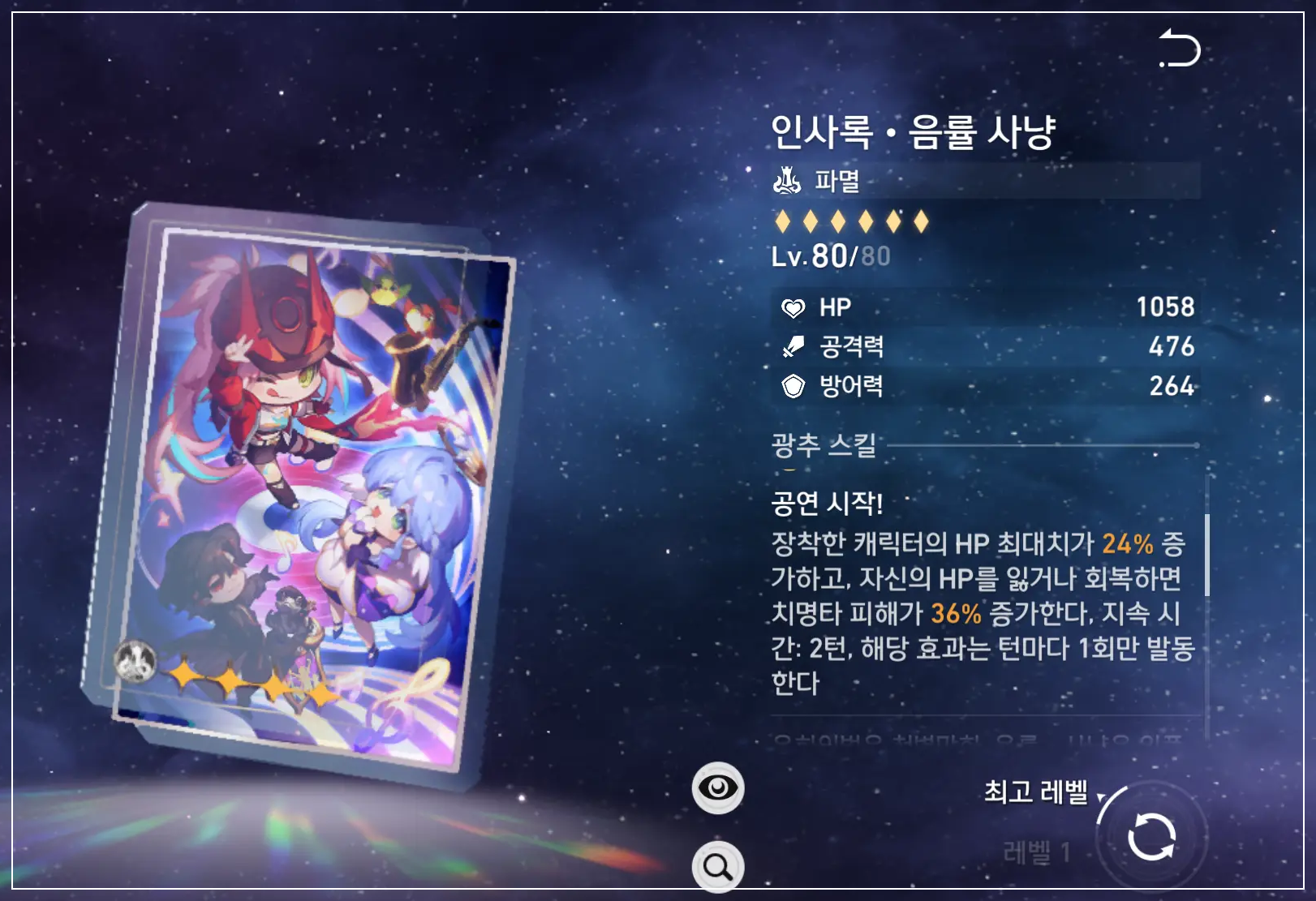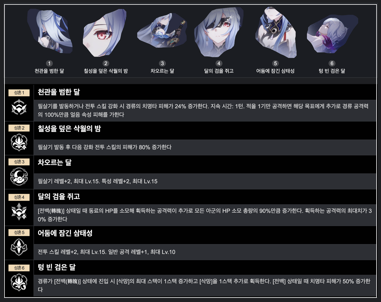 | 부 옵션 | 1 순위 : 치명타 확률 2 순위 : 치명타 피해 3 순위 : HP% 4 순위 : 속도 |