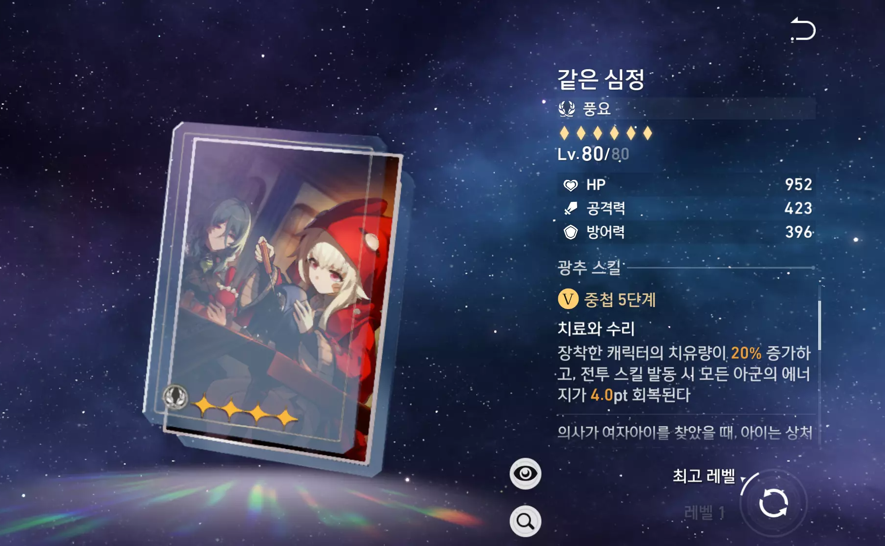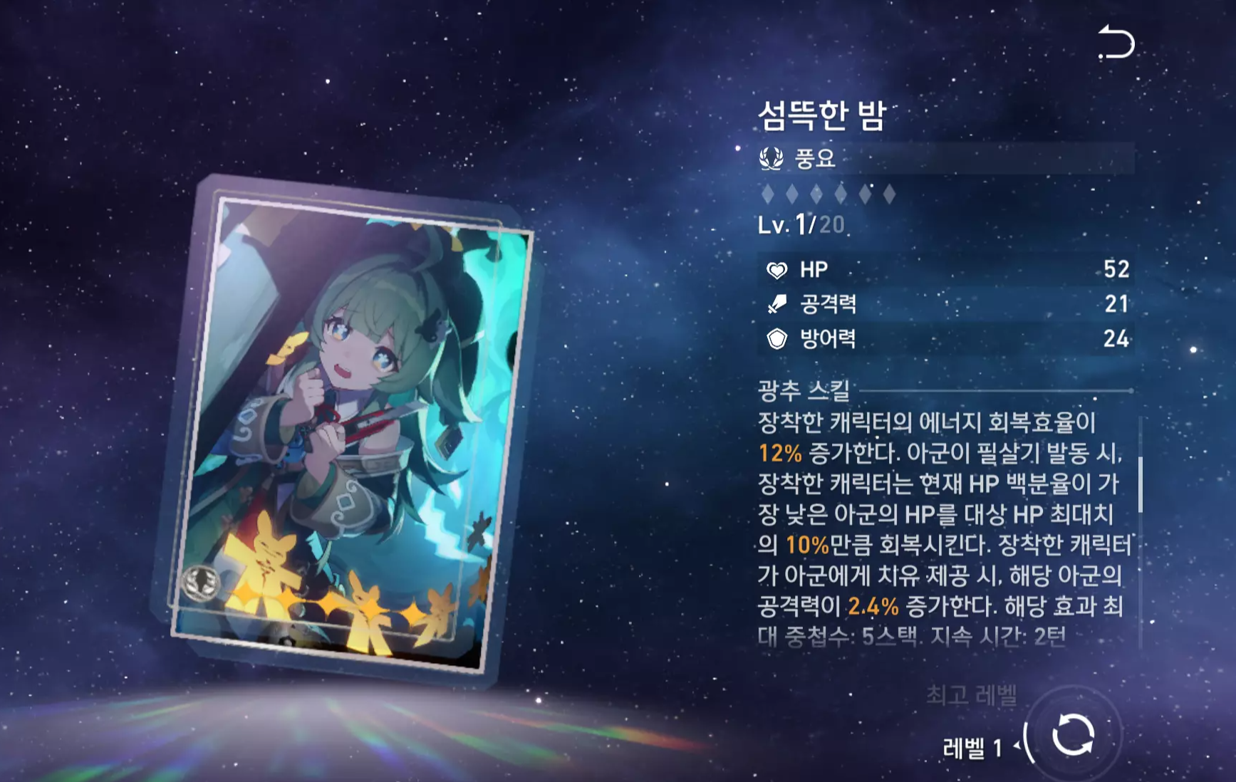 | 주 옵션 | 치유량 증가 or HP% | 속도 | HP% | 에너지 충전 효율 |