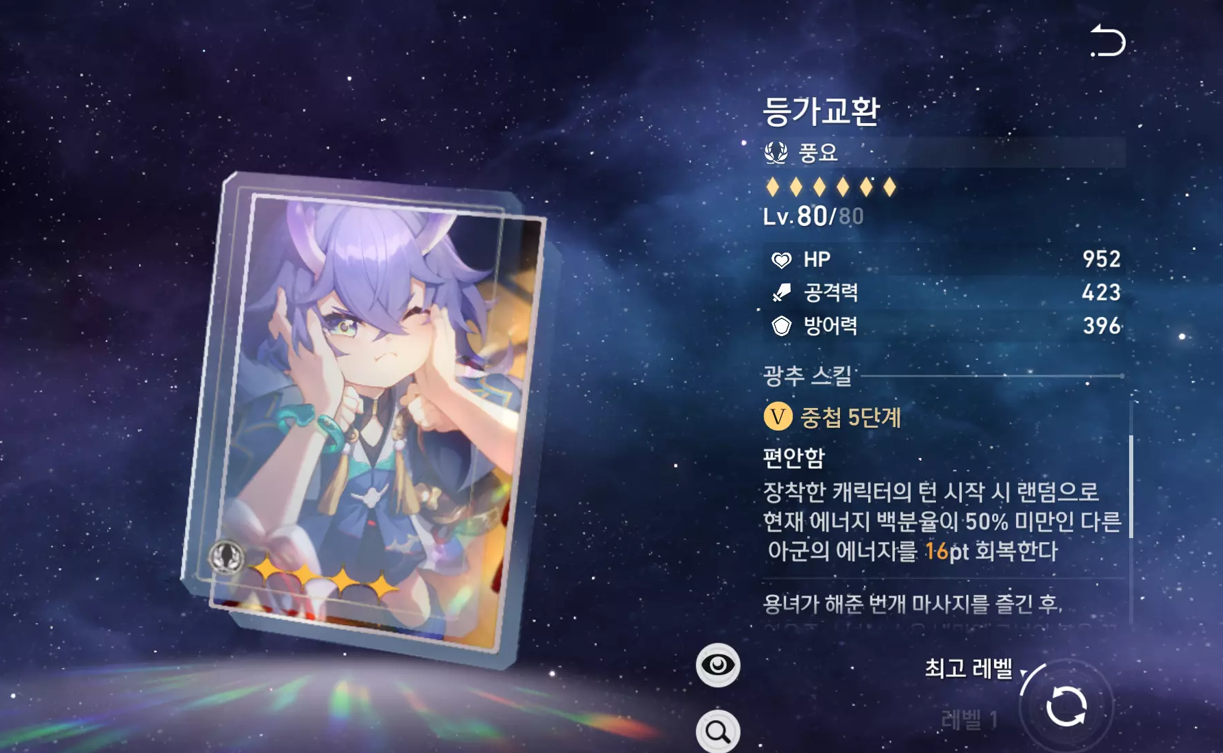 | 주 옵션 | 치유량 증가 or HP% | 속도 | HP% | 에너지 충전 효율 |