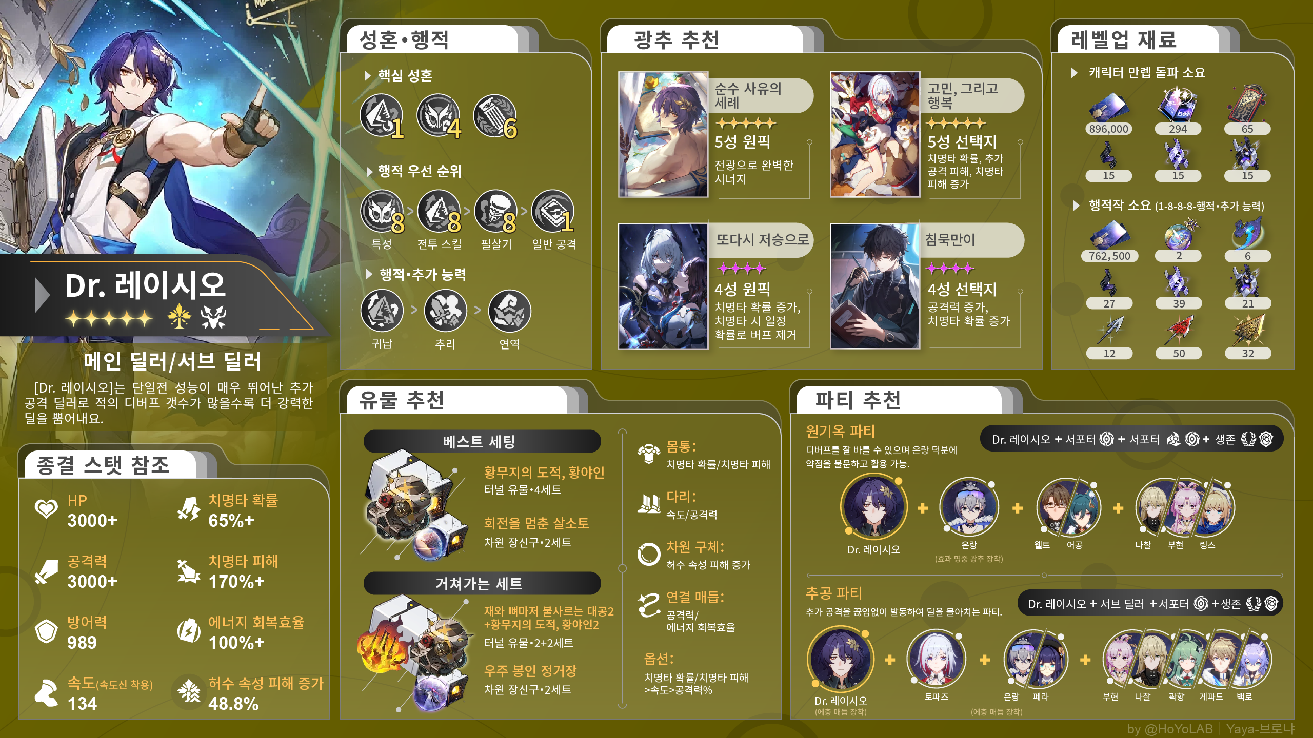 붕괴 스타레일 레이시오 가이드 성능 광추 유물 성흔 파티 조합 추천 공략 2024년 3월