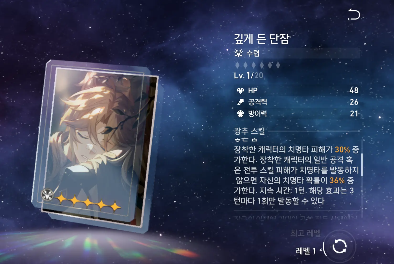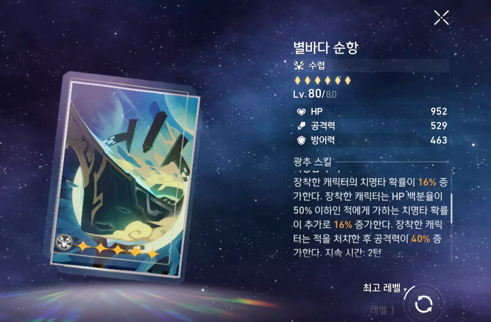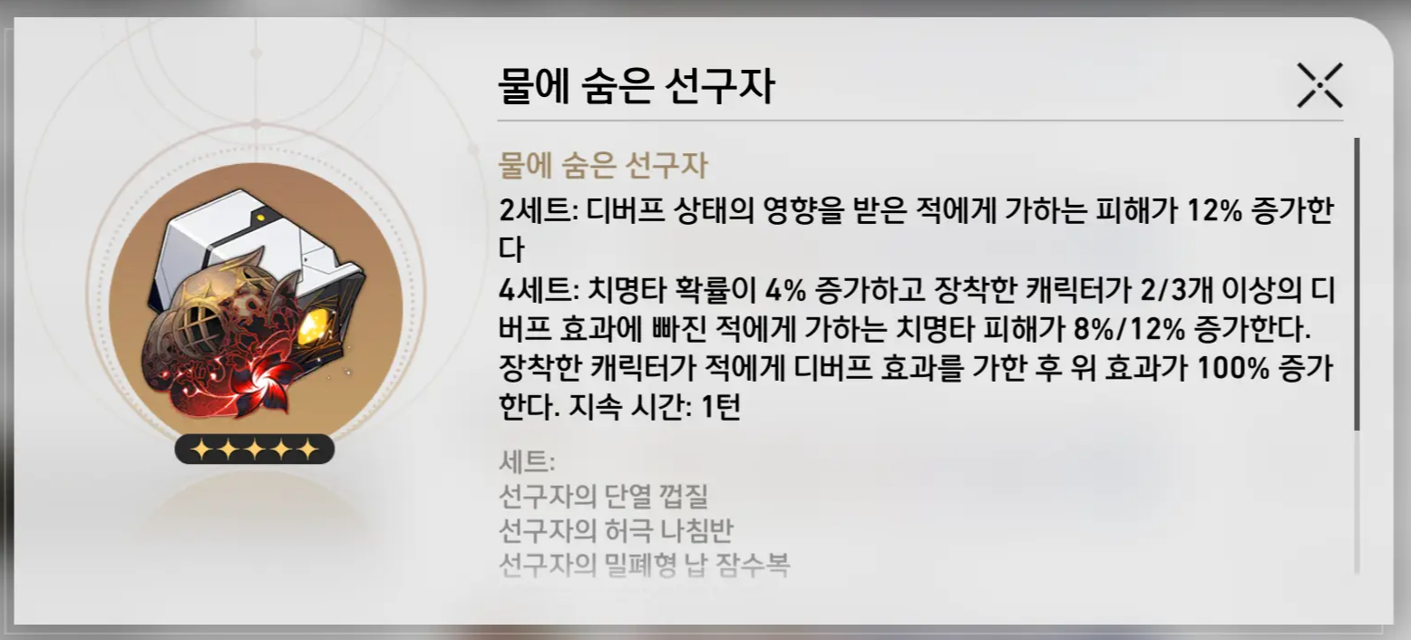 | 부 옵션 추천 | 1순위:치명타 확률or피해 2순위:공격력% 3순위:공격력 4순위:속도or효과 명중 |