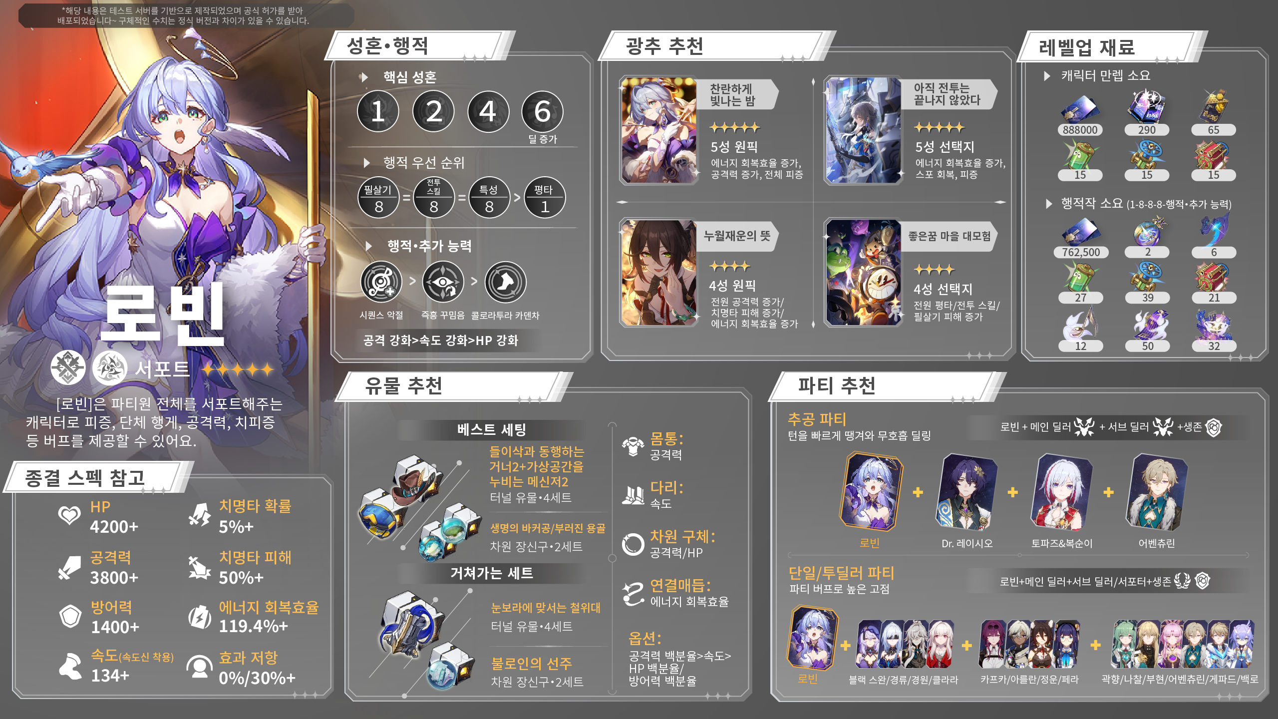 붕괴 스타레일 로빈 성능 광추 유물 세팅 돌파 파티 조합 추천 가이드 공략 2024년 9월