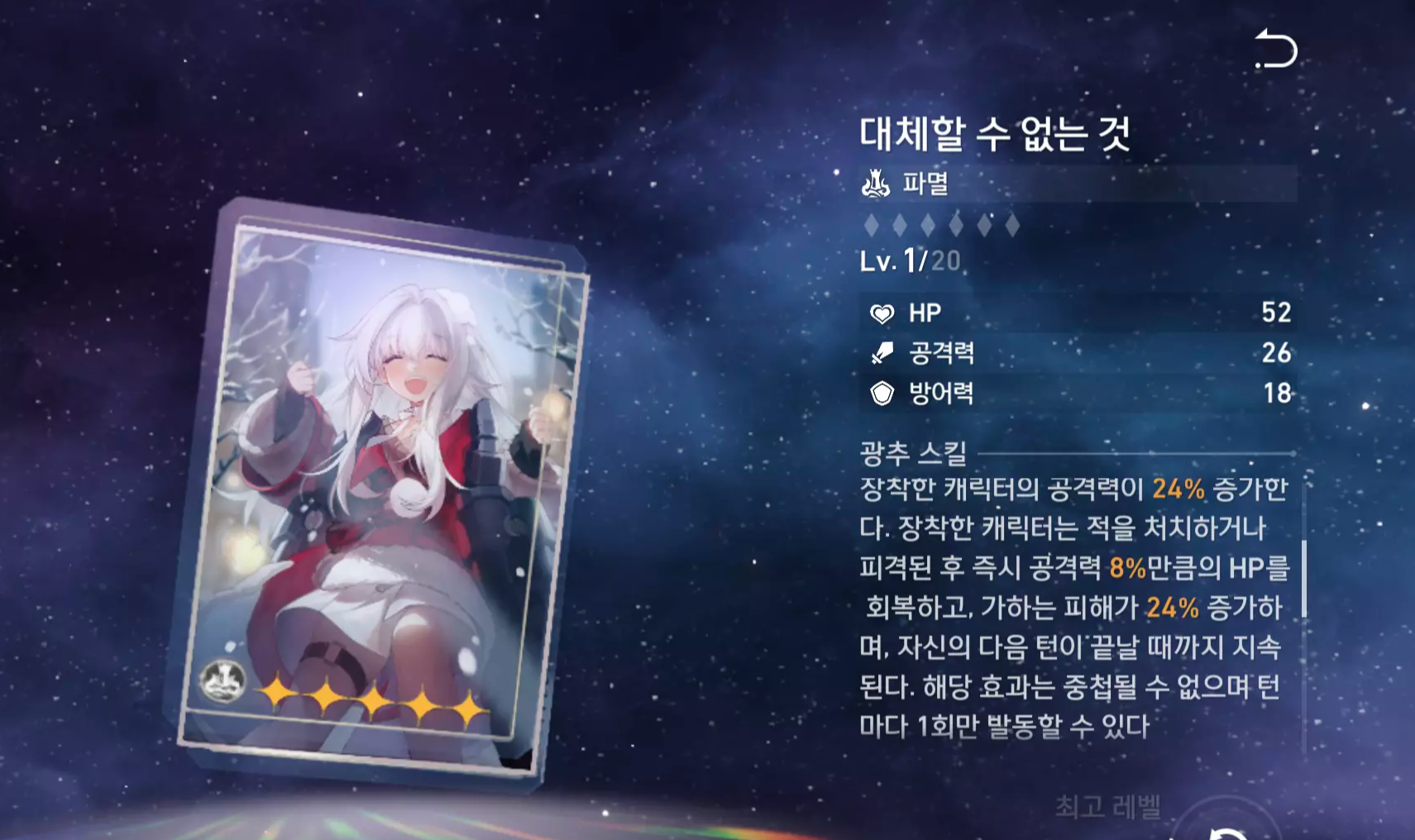| 부 옵션 추천 | 1순위 : 치명타 피해 2순위 : 공격력% 3순위 : 공격력 4순위 : 격특or효명 |