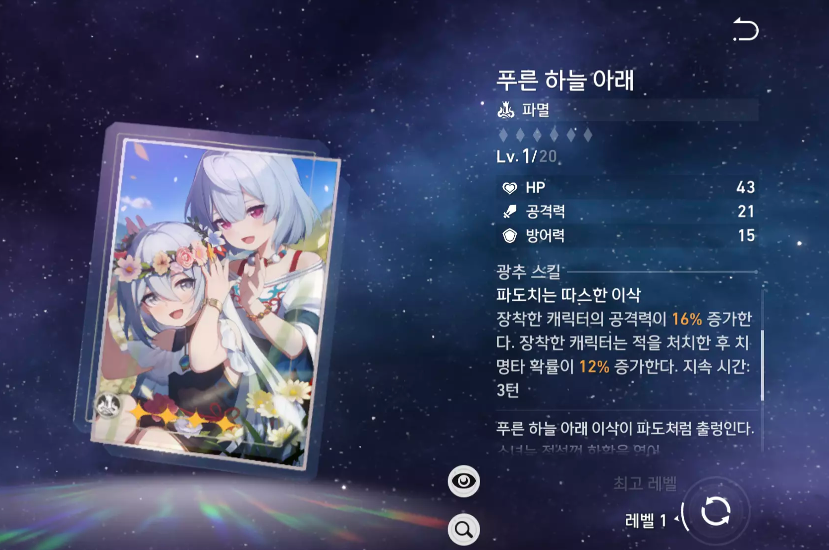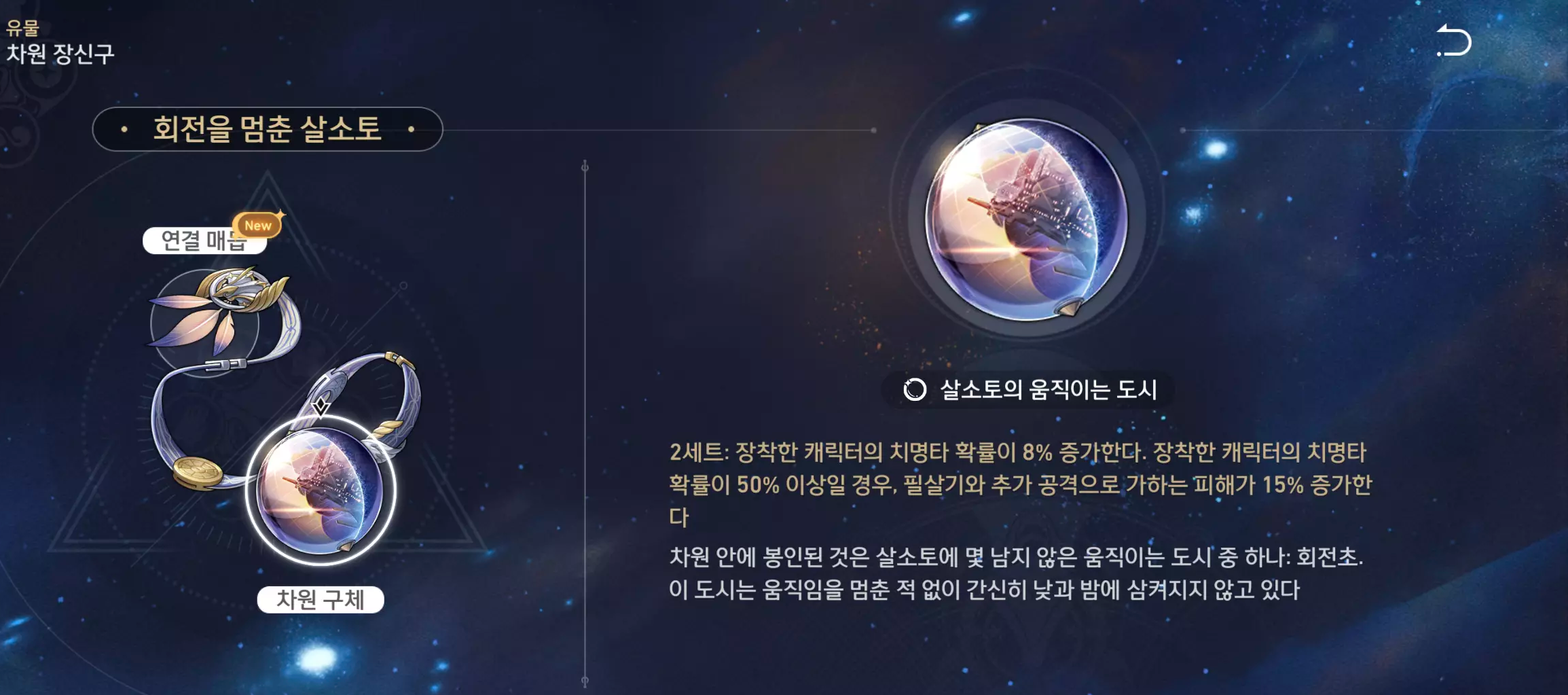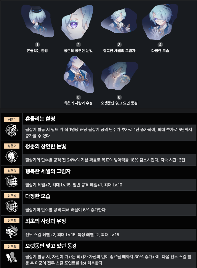 | 부 옵션 추천 | 1순위 : 치명타 피해 2순위 : 공격력% 3순위 : 공격력 4순위 : 격특or효명 |