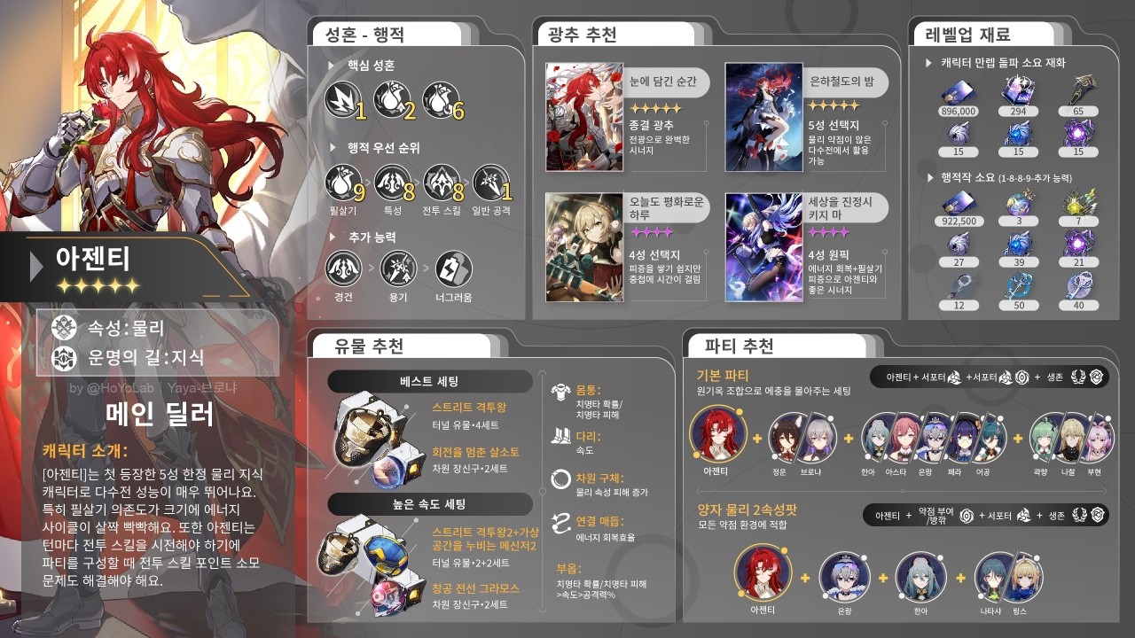 붕괴 스타레일 2.3v 아젠티 가이드 성능 광추 유물 장신구 파티 조합 추천 공략