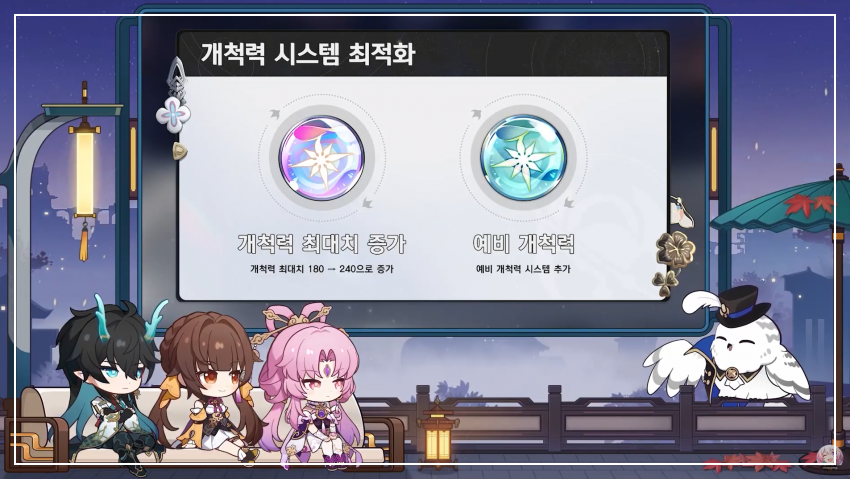 바로 개척력 최대치 증가와 예비 개척력입니다.