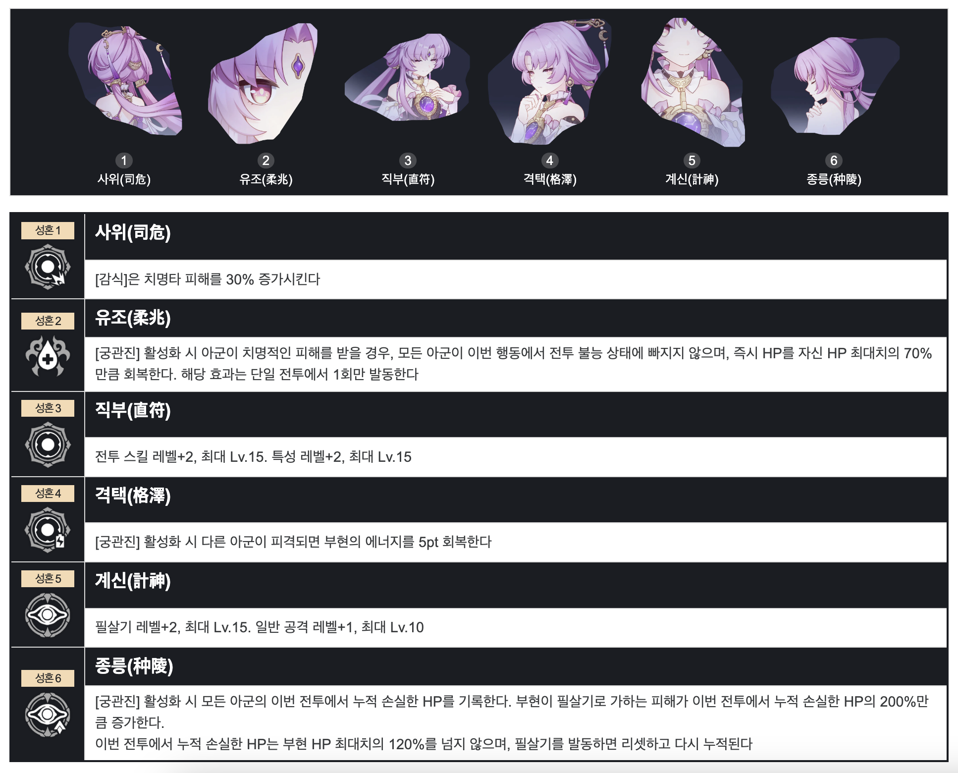 피해 감소, 피해 분담, HP 회복, 치명타 확률 증가를