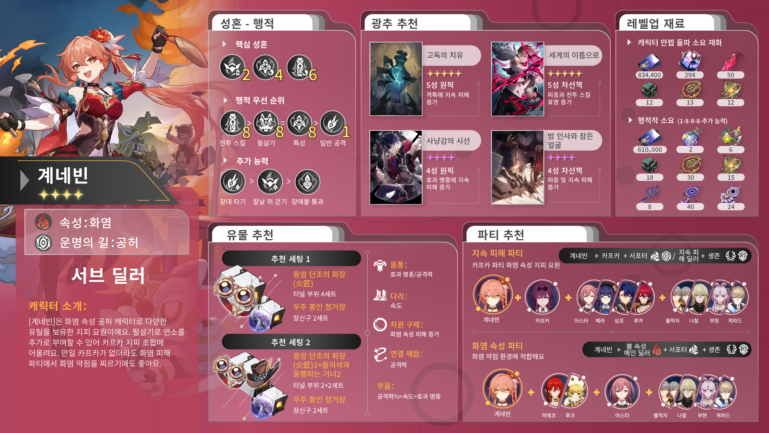 붕괴 스타레일 2.0 버전 계네빈 성능 공략 광추 유물 장신구 파티 조합 추천