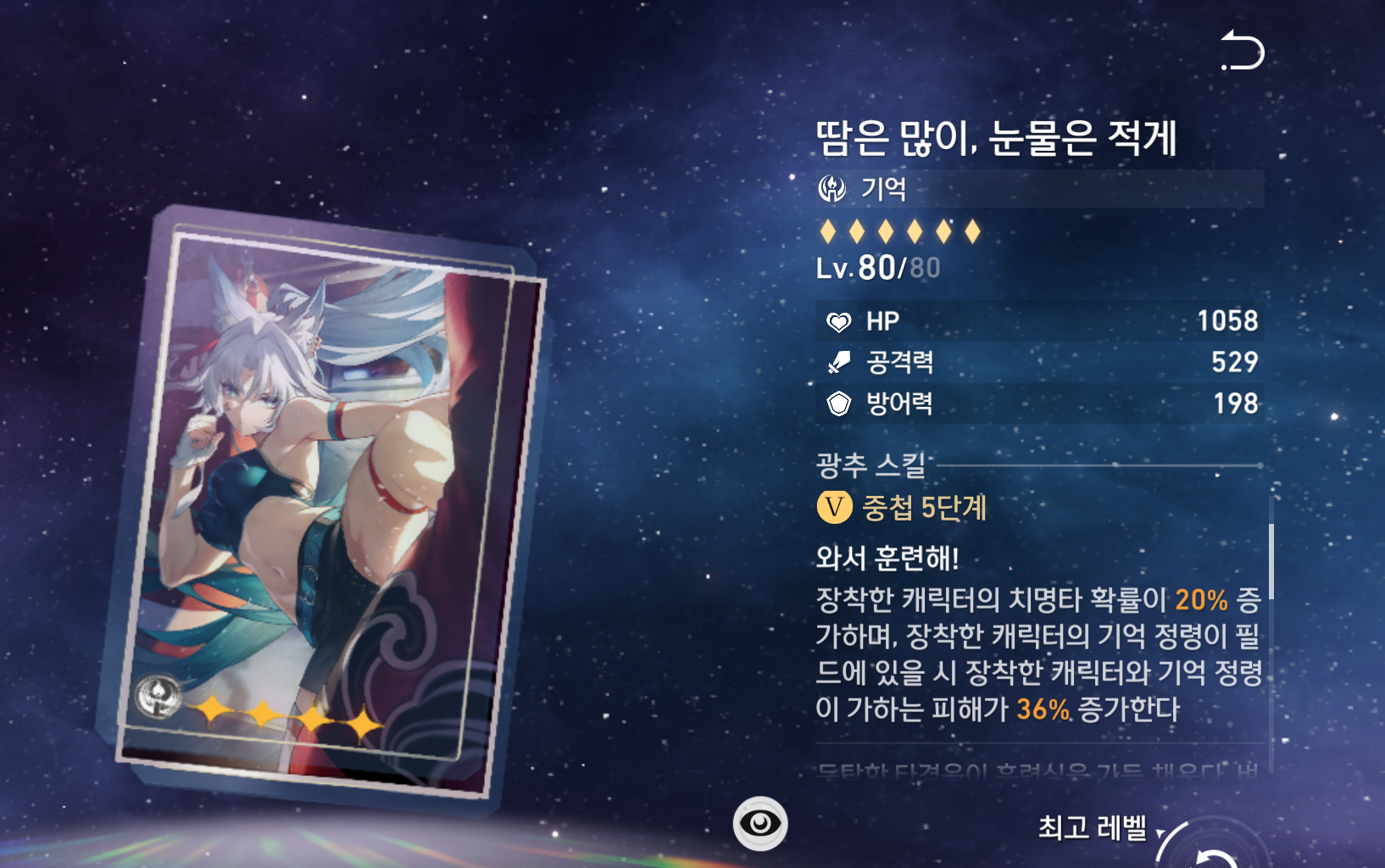 | 부 옵션 추천 | 1 순위 : 속도 2 순위 : 치명타 확률 3 순위 : 치명타 피해 4 순위 : 공격력 관련 |