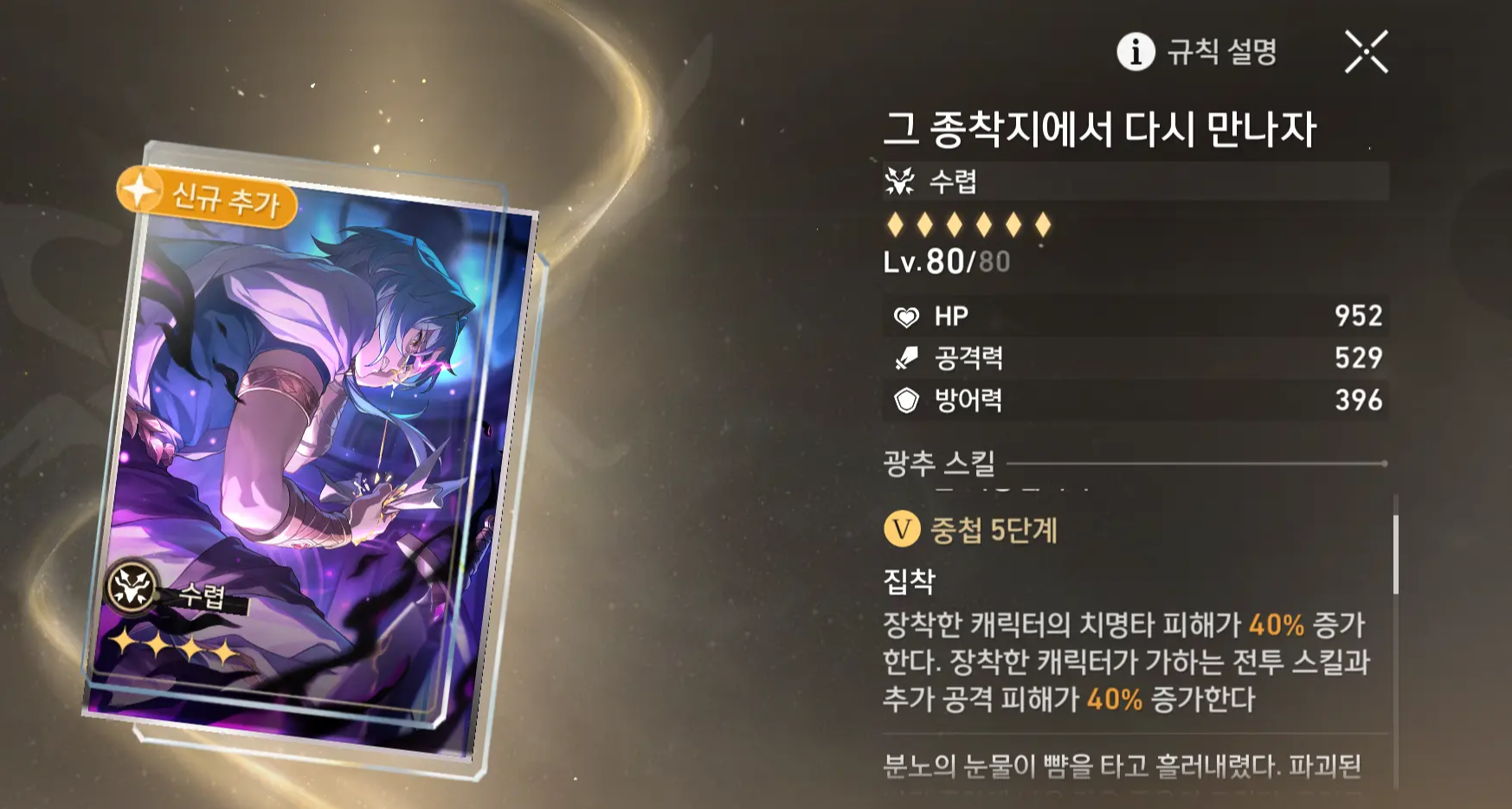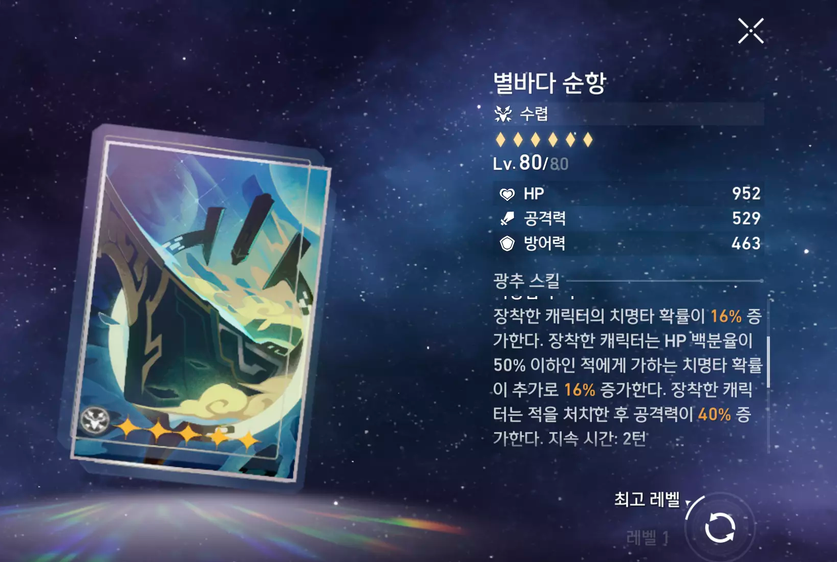 | 부 옵션 추천 | 1 순위 : 치명타 피해 2 순위 : 공격력% 3 순위 : 치명타 확률 4 순위 : 공격력 |