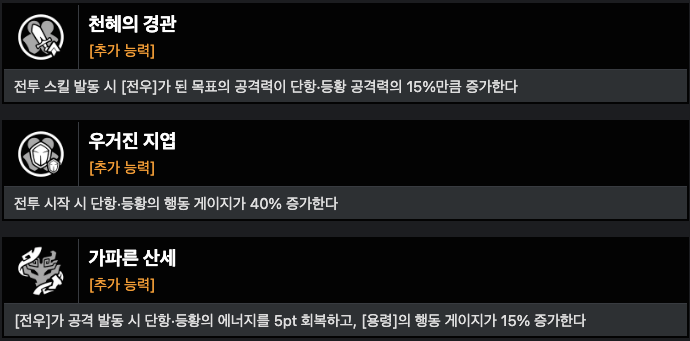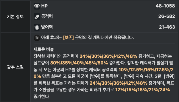 가장 낮은 아군에게 단항의 공격력 5% + 100만큼의 실드 부여.