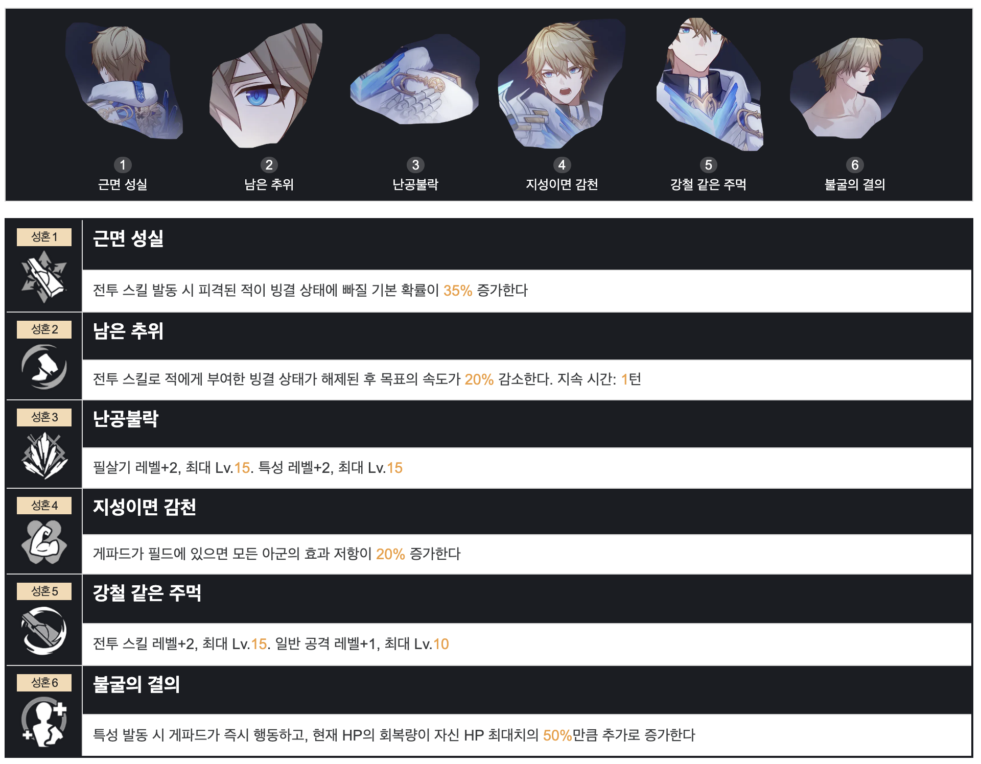 1 순위 : 방어력 2 순위 : 체력 % 3 순위 : 효과 명중 4 순위 : 효과 저항 |