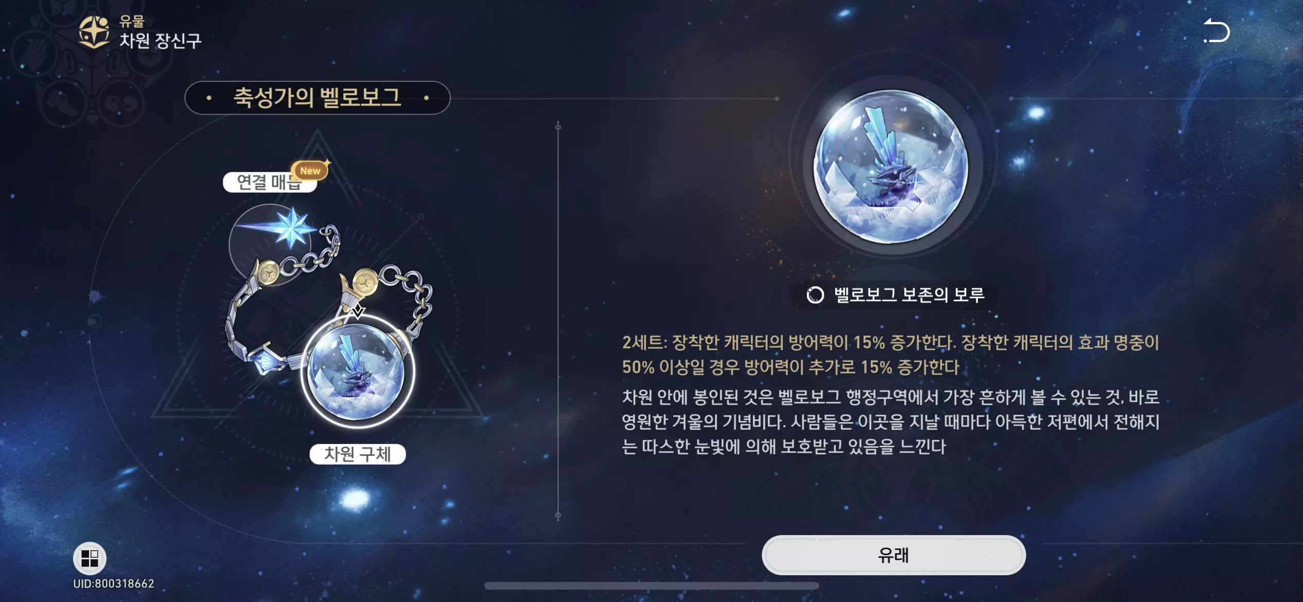 | 부 옵션 | 1 순위 : 방어력 2 순위 : 체력 % 3 순위 : 효과 명중 4 순위 : 효과 저항 |
