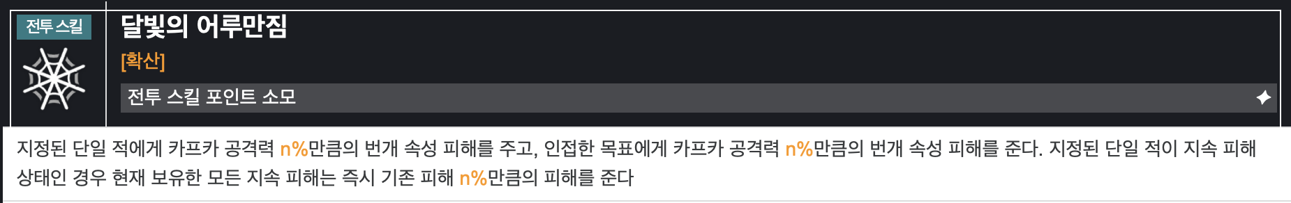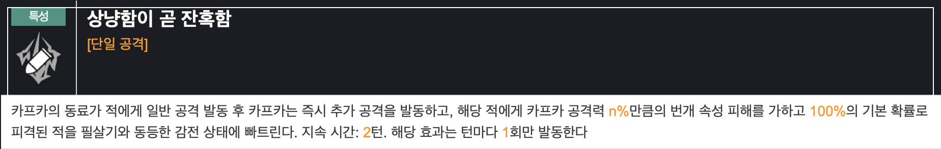 이 필살기 덕분에 지속피해만으로도 카프카가 딜이 잘 나오는 것입니다.