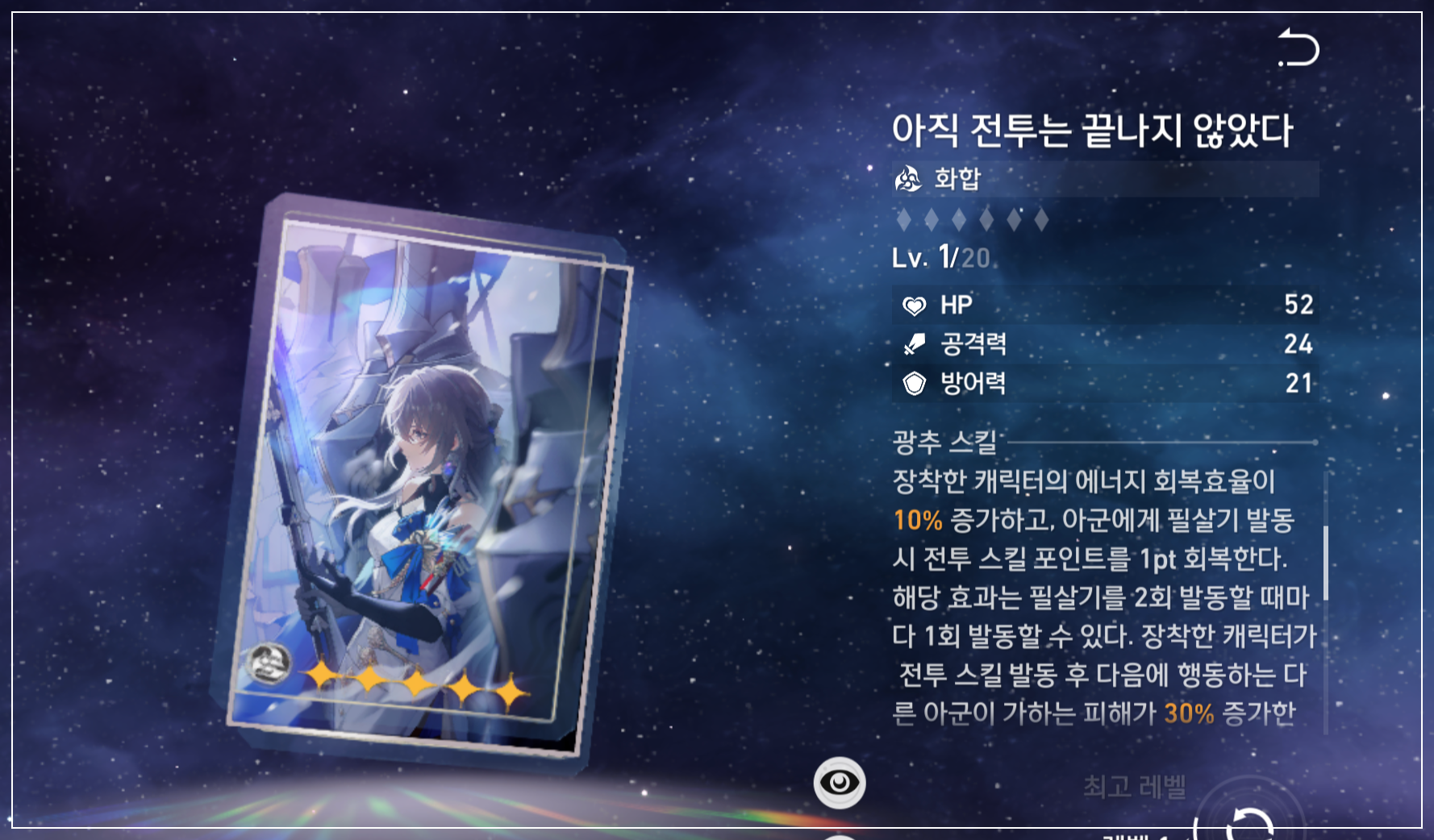 에너지 회복 효율 10%, 스킬 포인트 1 회복