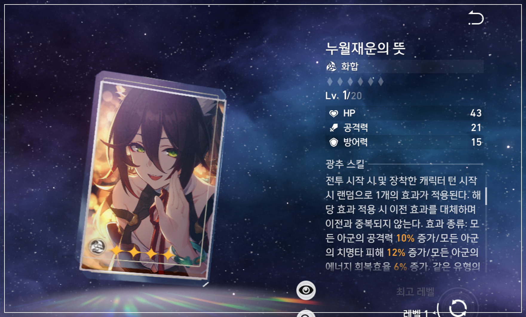 아군 공격력 10%, 치명타 피해 12%, 에너지 회복효율 6%