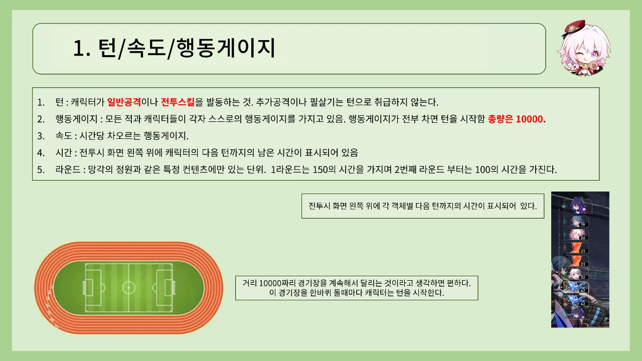 플레이 턴 방식 및 속성별 효율