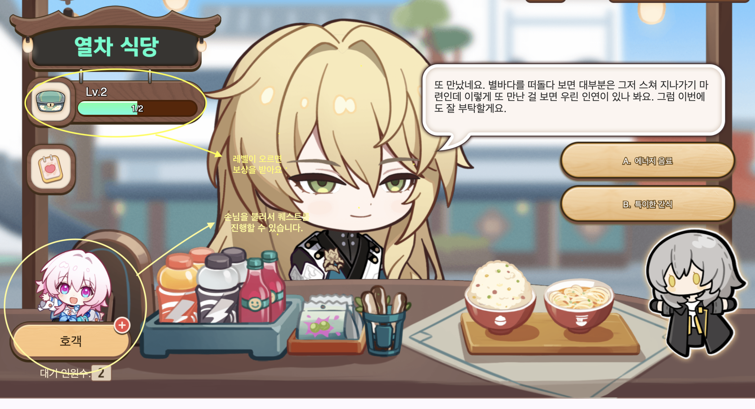 이런식으로 게임이 진행이 되는데, 먼저 손님이 오면 음식을 만들어 주면 왼쪽 상단에 레벨이 오르면서 보상을 얻는 그런 방식입니다. 호객, 즉 손님을 모으려면..