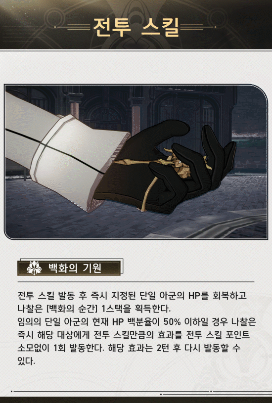 전투 스킬이 제일 중요하죠? 전투 스킬을 아군에게 나찰의 공격력만큼 회복시키고 [백화의 순간]을 1 스택 획득합니다.
