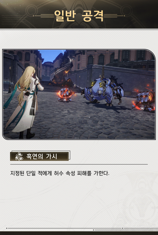 일반 공격은 뭐, 모든 캐릭터들의 공통점인 캐릭터 속성의 단일 공격입니다. 설명이 필요 없으니 넘어가도록 하겠습니다.