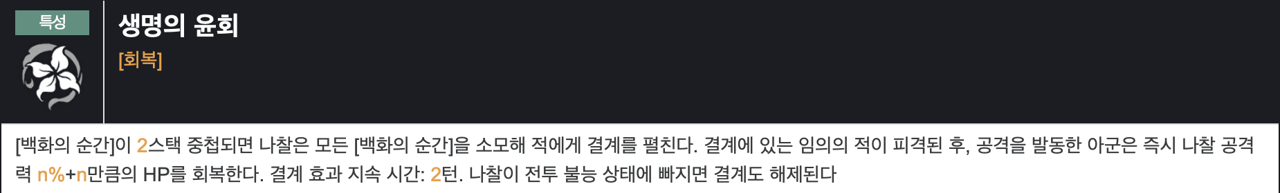나찰의 특성인 [백화의 순간]입니다. 설명에서도 나와있듯이 2 스택이 쌓이면 자동적으로 결계를 펼치는데