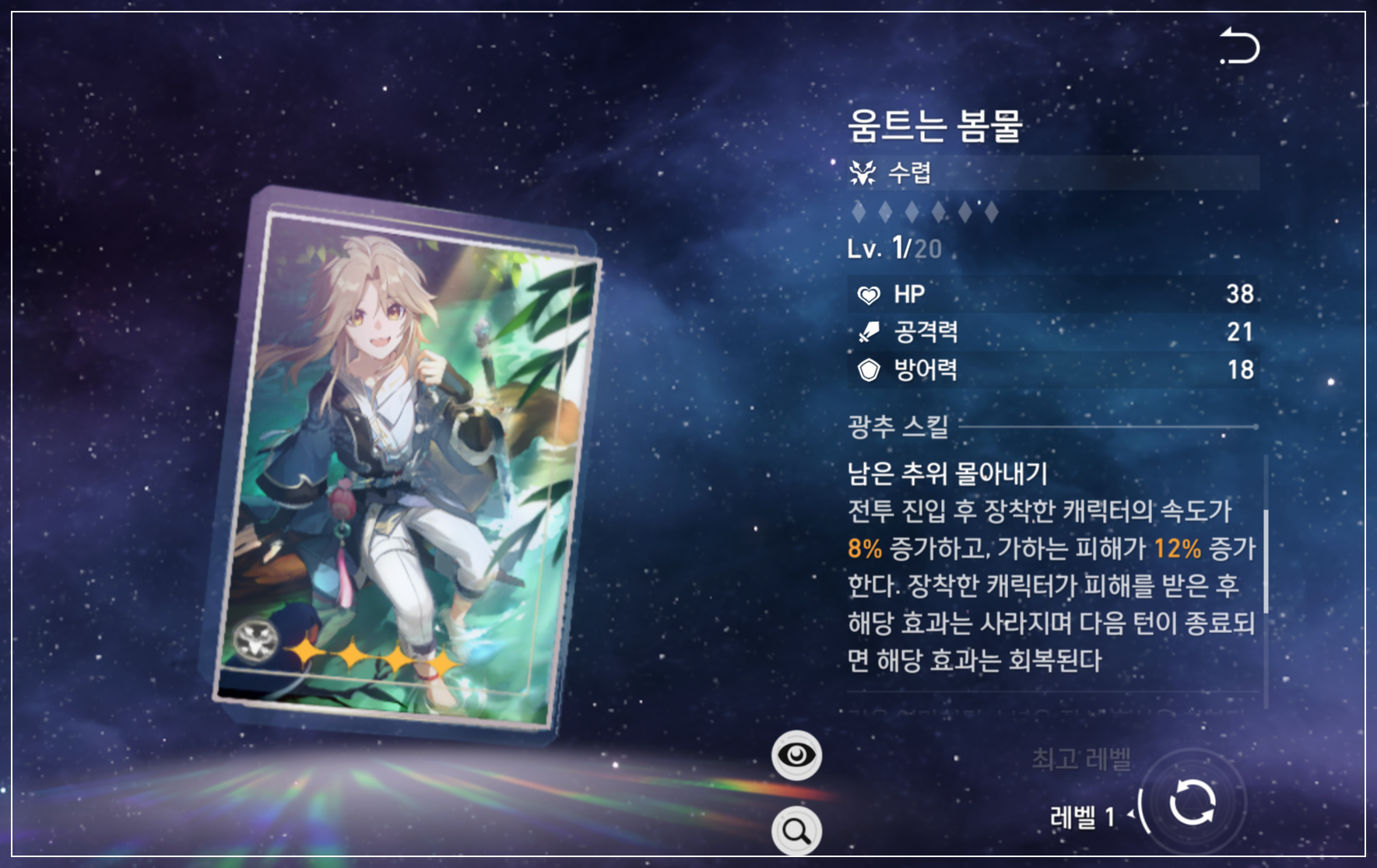 망각의 정원에서 구입할 수 있어서 얻기도 쉽고 제련도 쉽다는 장점이 있습니다. 움트는 봄물은 5중첩 기준 속도 12%, 피증 24%를 제공하는데, 피격 시 버프가 꺼지며 다음 턴 재생됩니다.