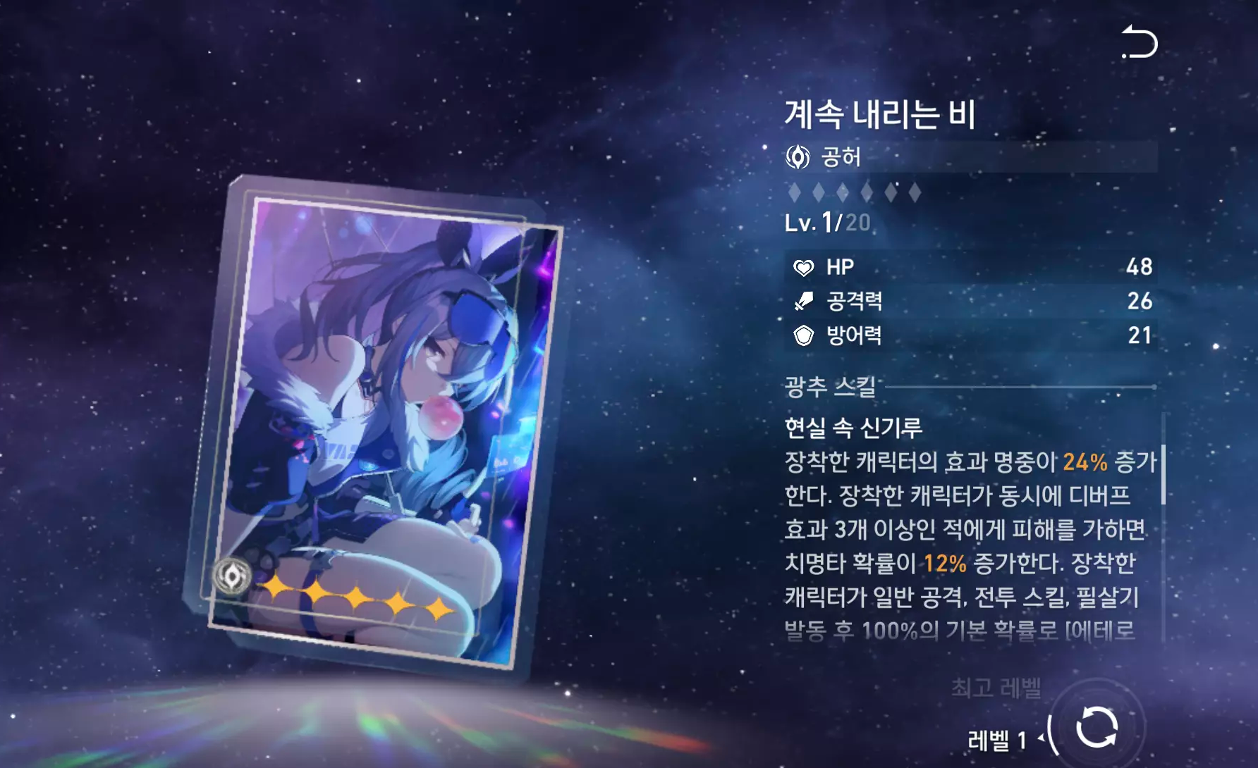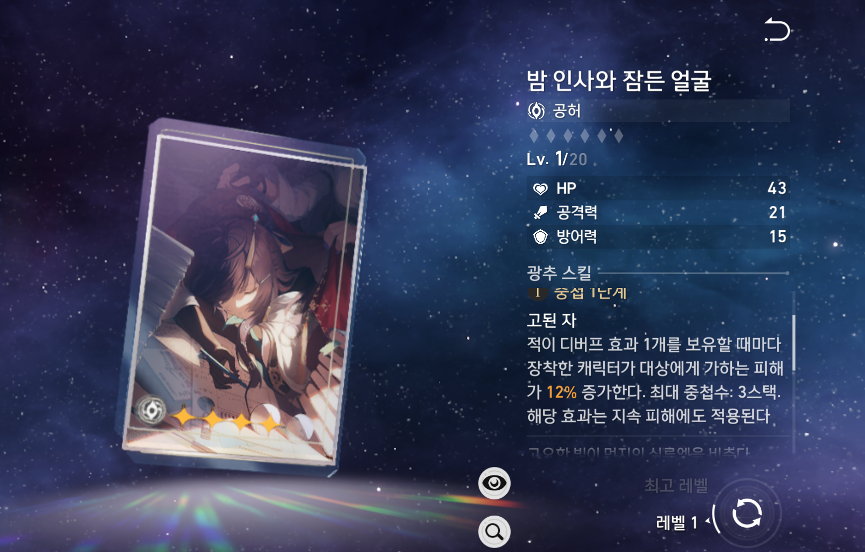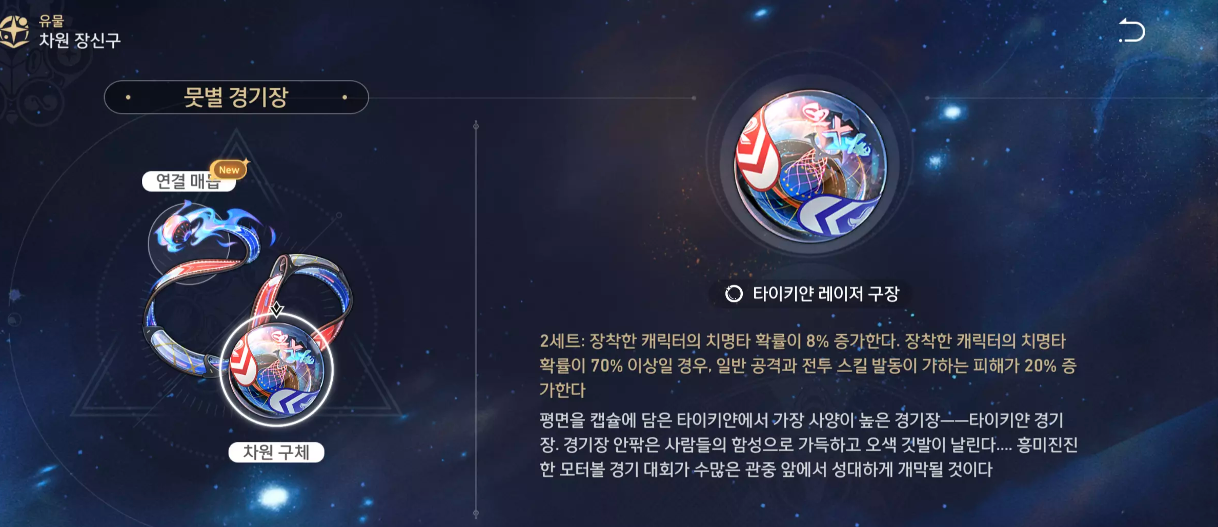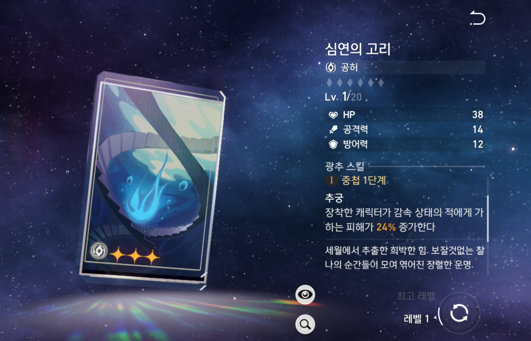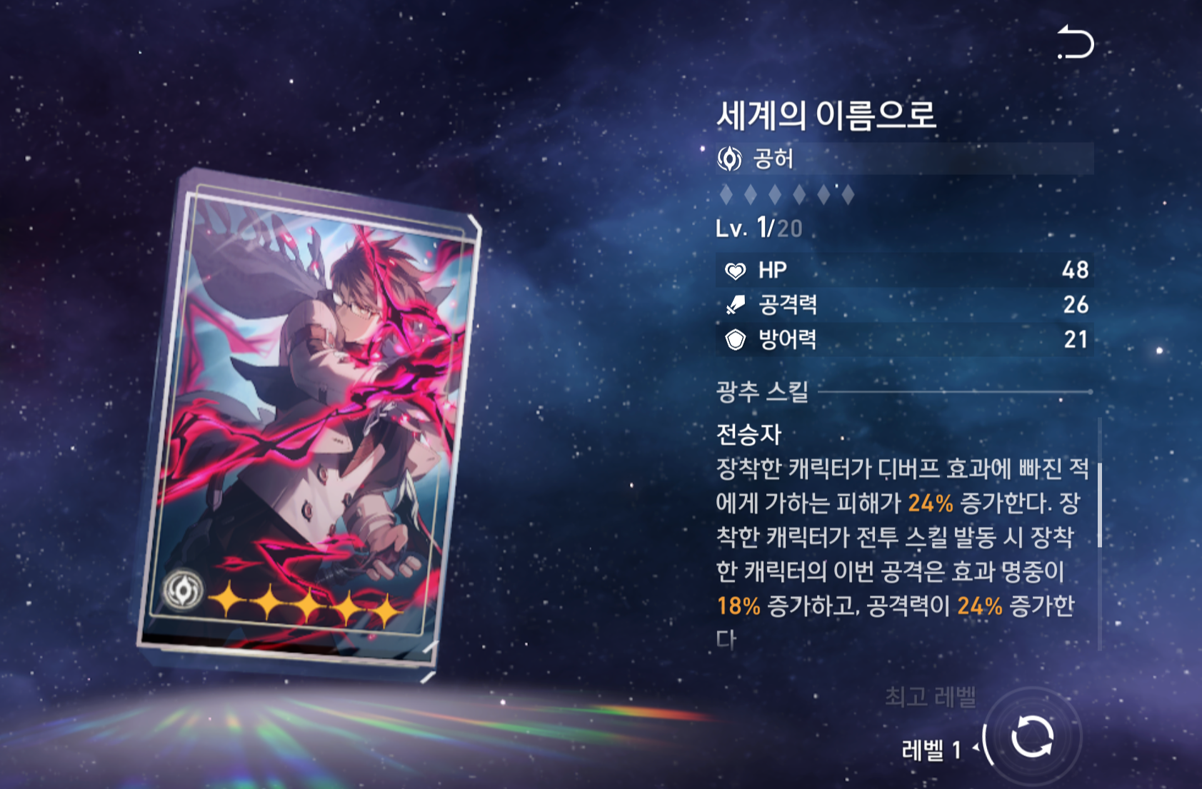 | 부 옵션 | 1 순위 : 치명타 피해 2 순위 : 공격력% 3 순위 : 속도 4 순위 : 효과 명중 |