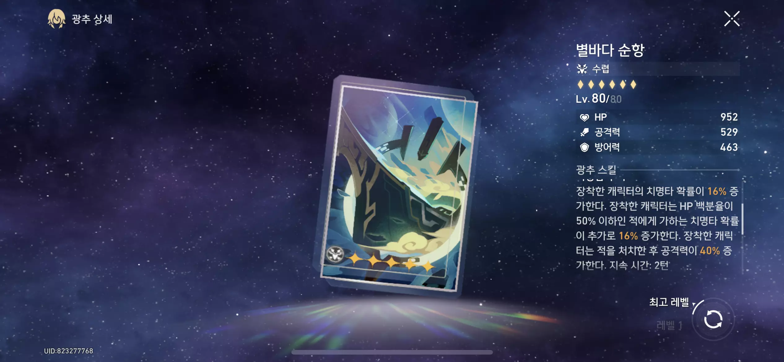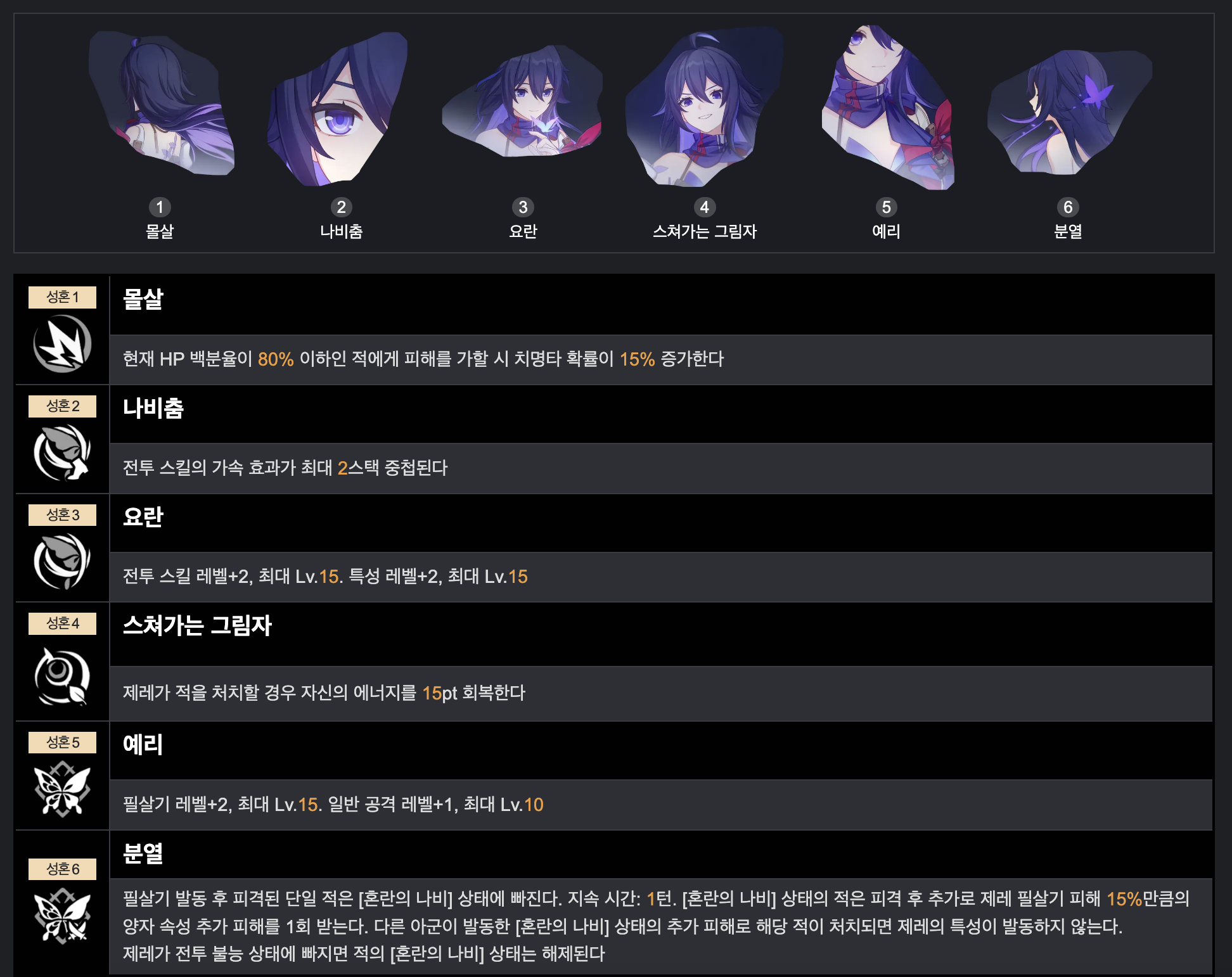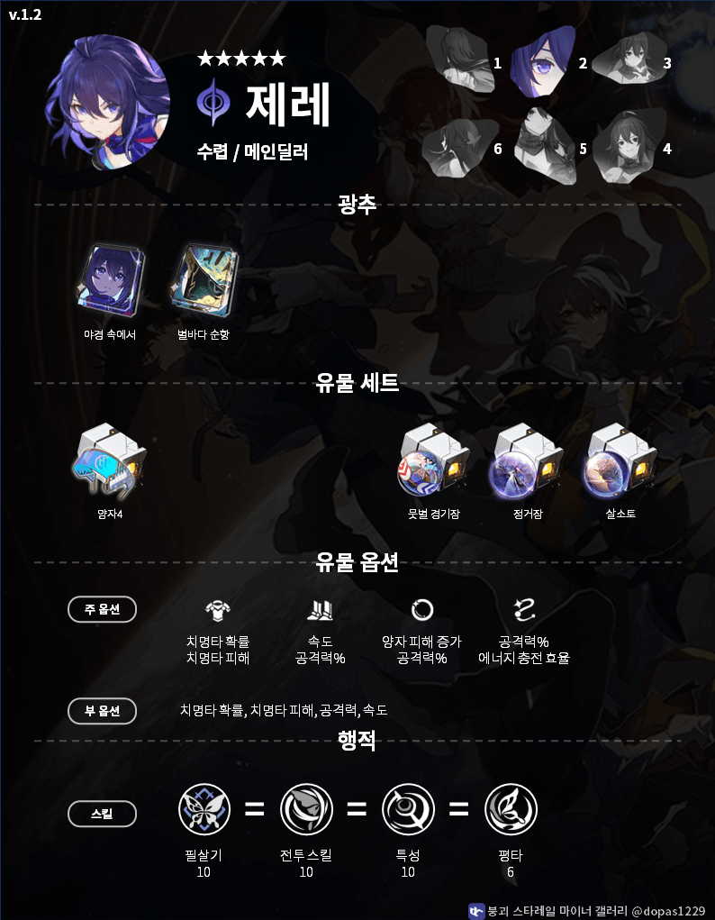| 부 옵션 | 1 순위 : 치명타 피해 치명타 확률 3 순위 : 공격력 % 4 순위 : 속도 |