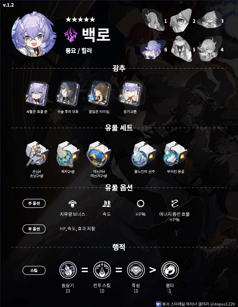 | 주 옵션 | 치유량 증가% | 속도 or HP% | HP% | 에너지 충전 효율 |