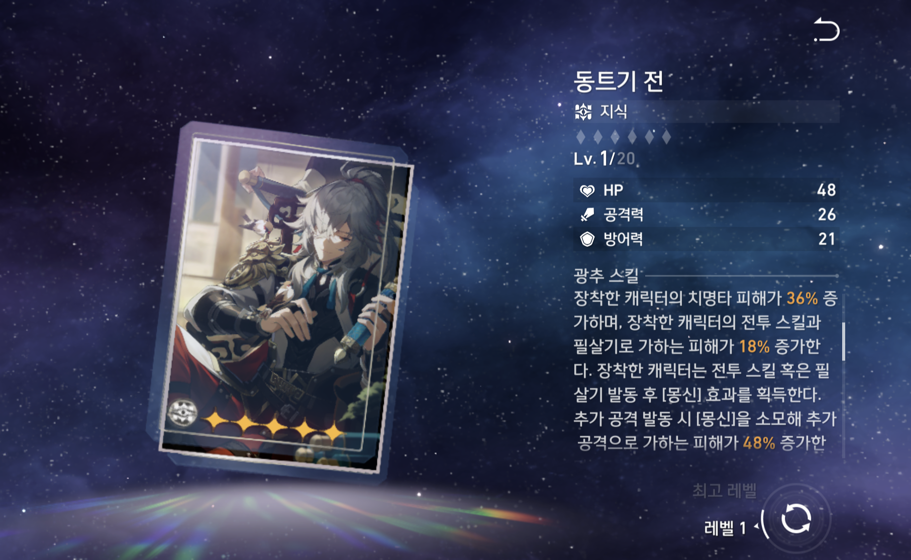 1 순위 : 치명타 확률 2 순위 : 공격력 3 순위 : 속도 4 순위 : 격파 특수 |