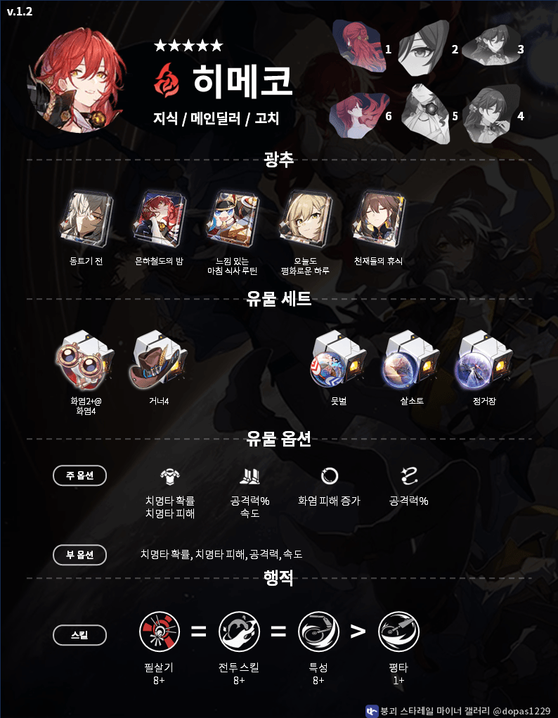 1 순위 : 공격력% 2 순위 : 치명타 확률 3 순위 : 속도 4 순위 : 공격력 |