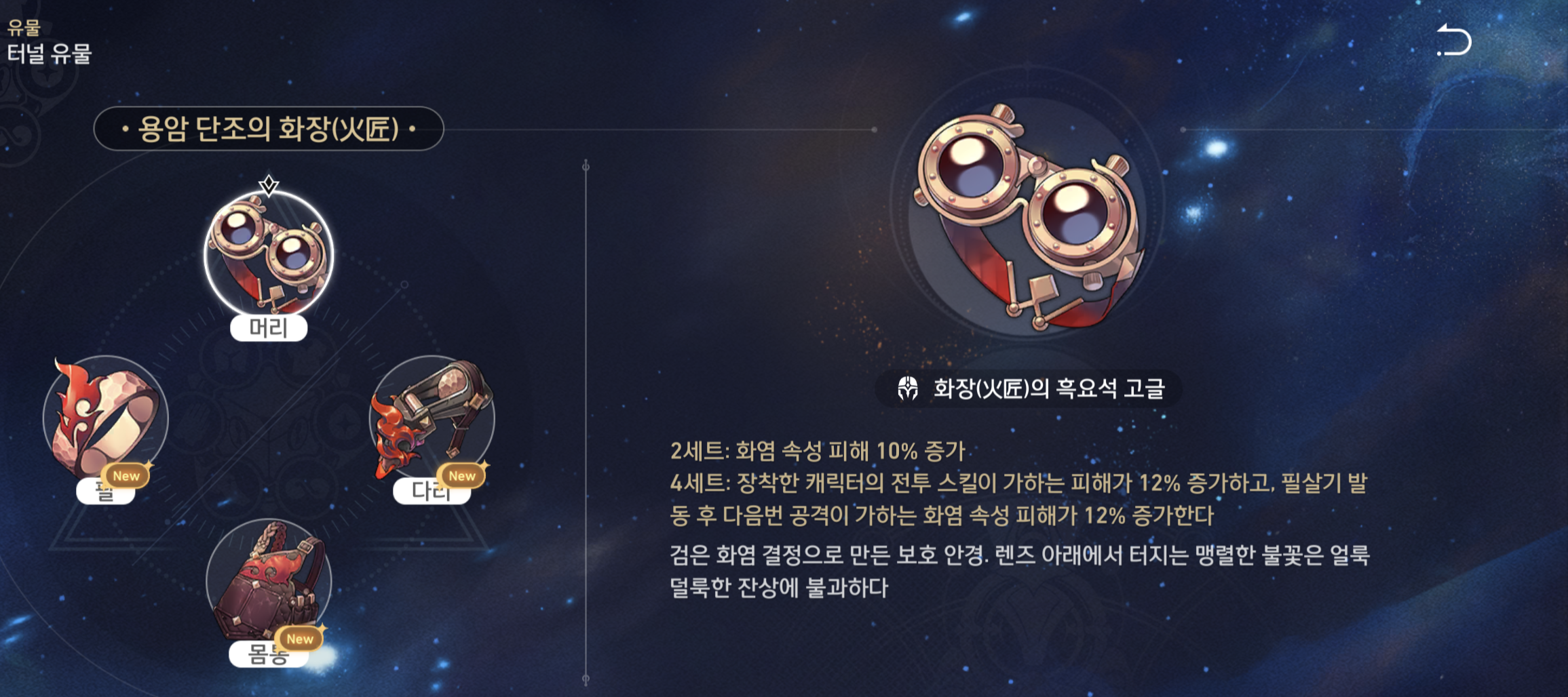 | 주 옵션 | 치명타 확률 or 공격력% | 공격력% | 화염 속성 피해 증가 | 공격력 % |