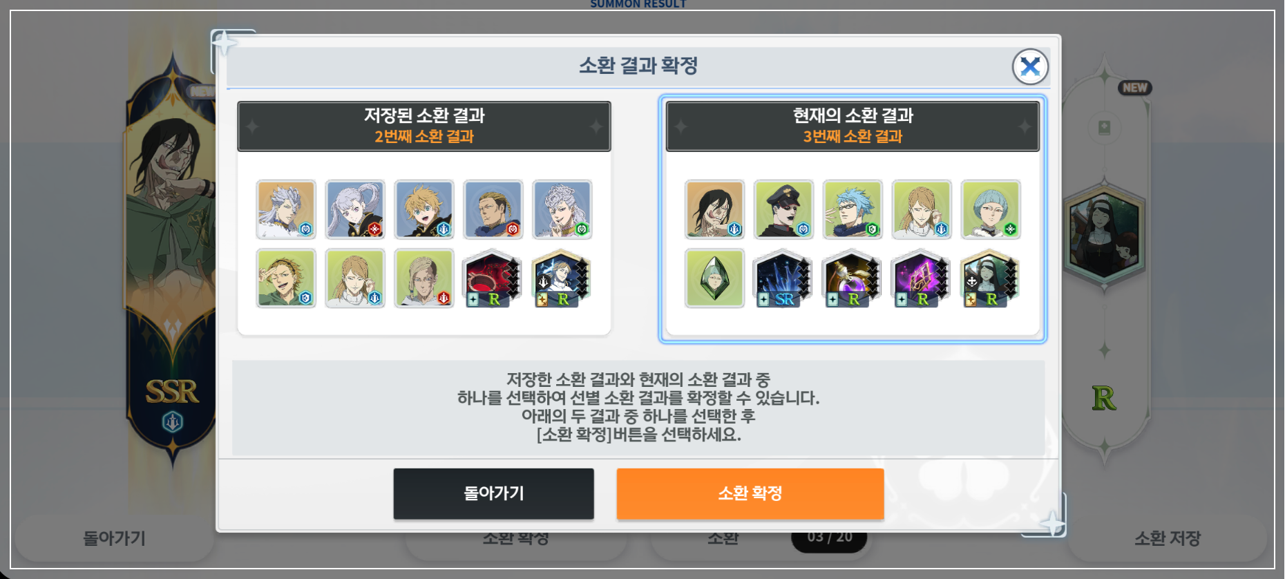마지막에 소환 확정 버튼을 누르면, 저장한 소환결과와 최종적으로 뽑은 소환 결과가 나오며