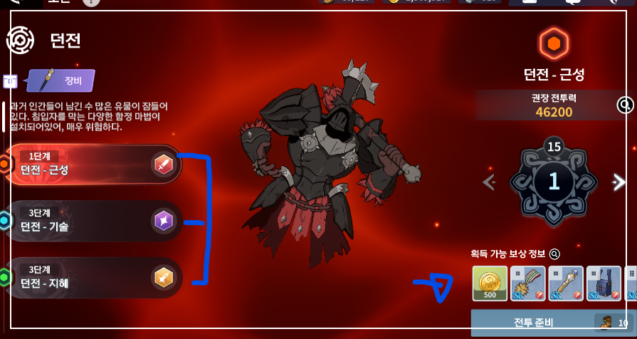 이때 일반 도전 탭에 들어가서 던전으로 들어가시면, [근성] [기술] [지혜] 각 각의 1,2 스테이지에서 클리어시