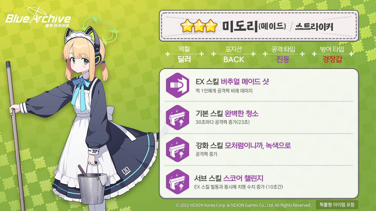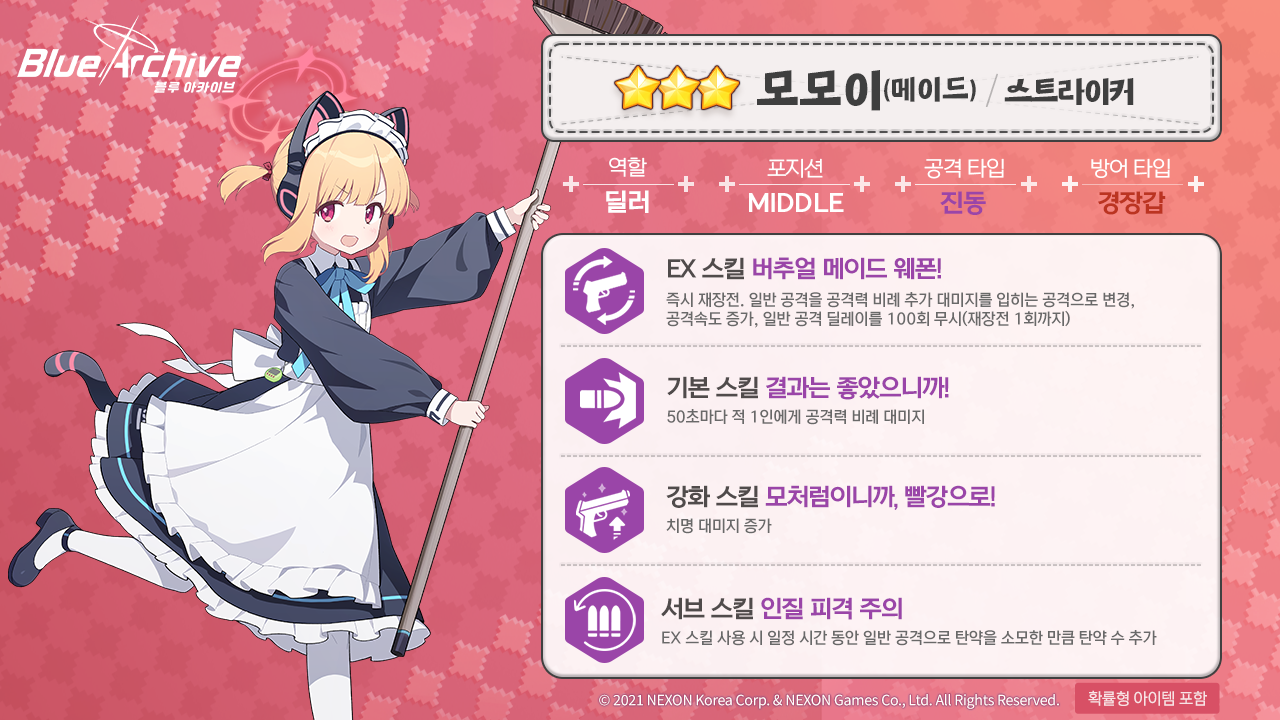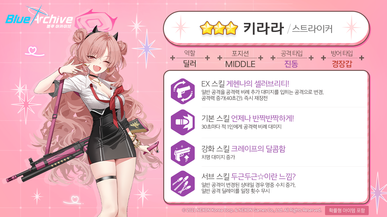 2 티어에 배치 스트라이커 / 진동 / 경장갑 범위가 넓은 EX와 생각보다 대미지도 준수. 스킬 코스트 + 공격 속도 증가 덕분에 잡몹 처리는 진짜 좋은 캐릭터. 시가지에서 조금 별로라서 그렇지 캐릭터는 이쁘기도해서 뽑는 것도 나쁘진 않아요. |