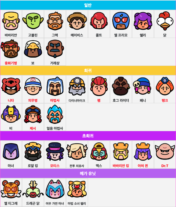 일반, 희귀, 초희귀, 메가 유닛.