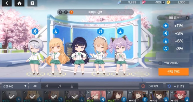 파티 구성 화면과 캐릭터 호감도 시스템 화면..