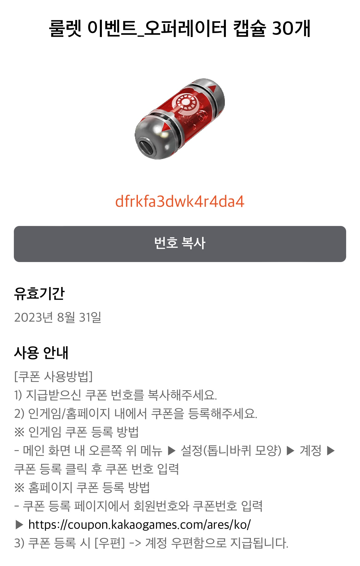 오른쪽과 같이 쿠폰 코드를 번호 복사하시면 됩니다.