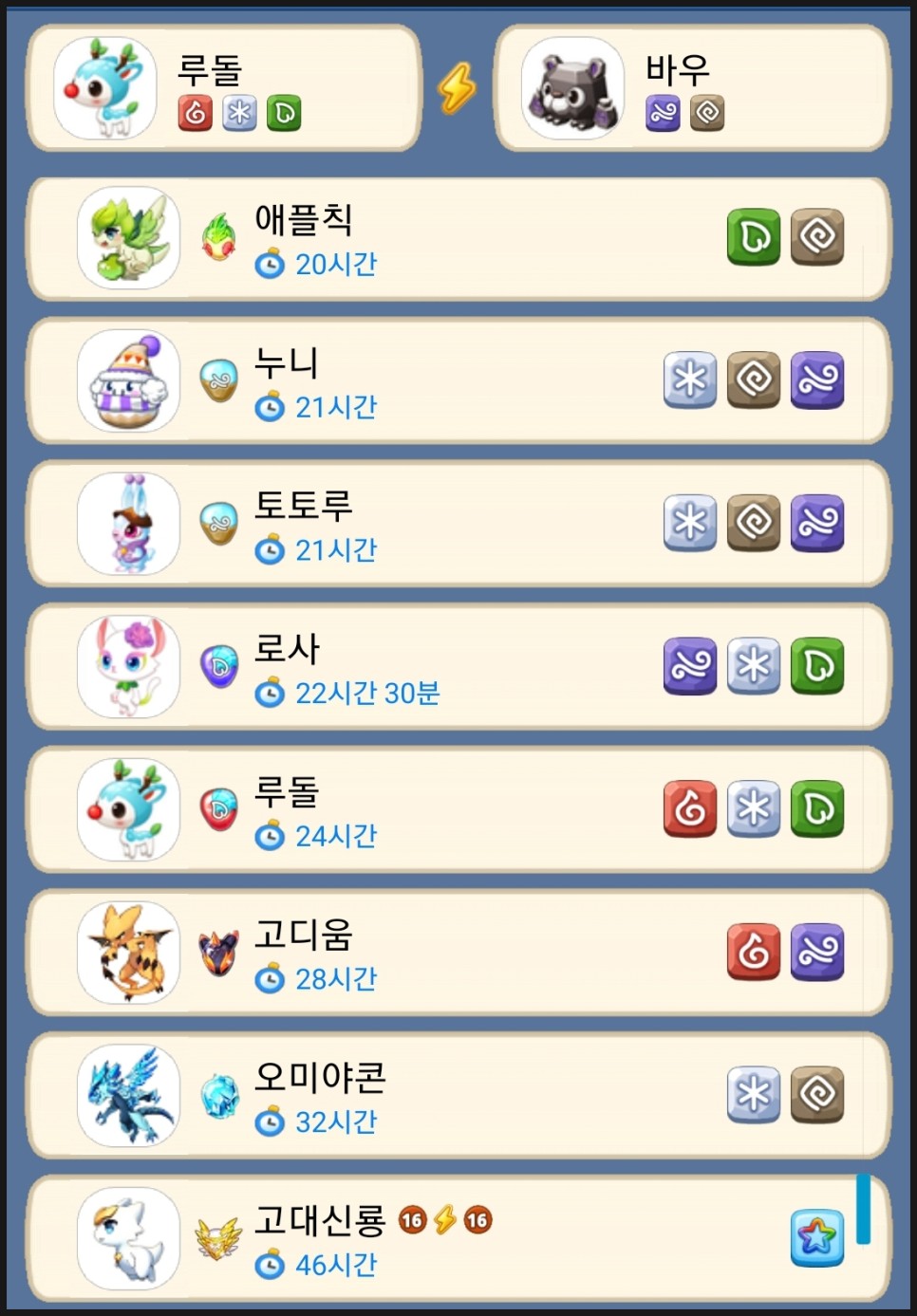 2마리의 우파루의 속성이 4 속성 이상이 돼야 합니다.