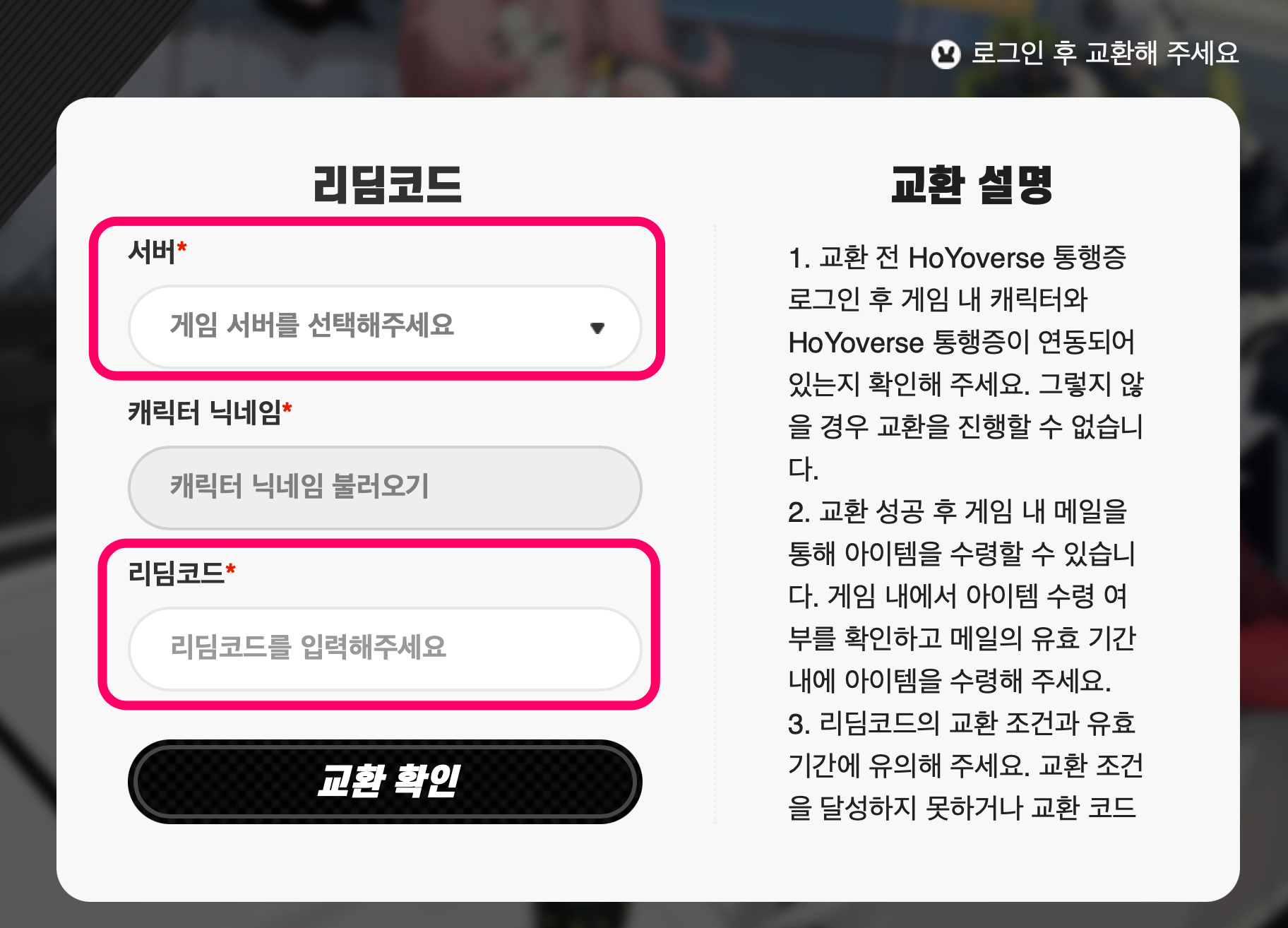 서버, 리딤코드를 잘 입력하세여 됩니다.