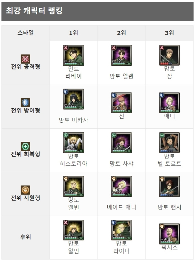 진격의 거인 일본 캐릭터 전위 후위 티어