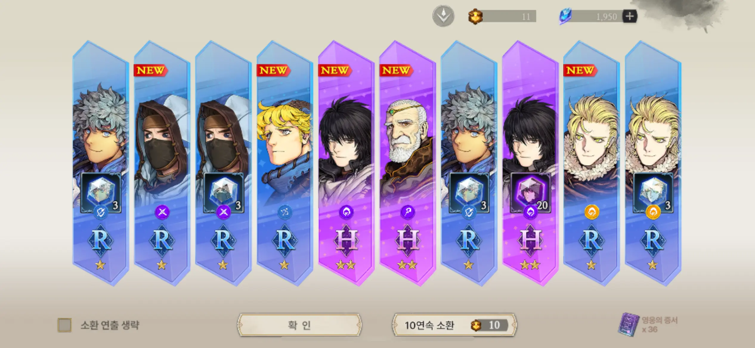 위에서부터 전설, 영웅, 희귀 등급의 캐릭터들이 존재합니다.