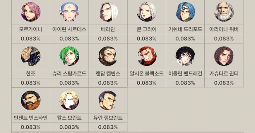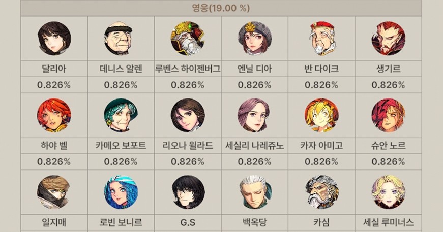 위에서부터 전설, 영웅, 희귀 등급의 캐릭터들이 존재합니다.