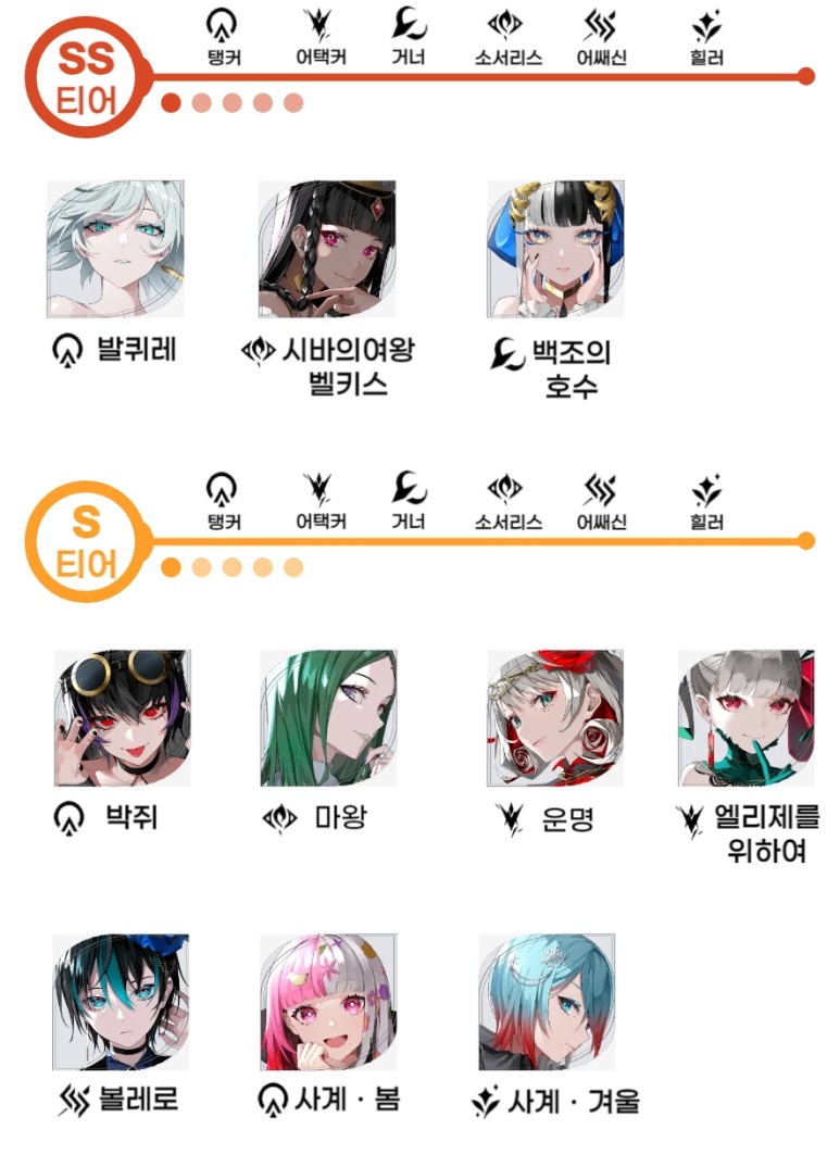 등급표에서 SS에 속하는 영웅은 3명으로 발퀴레, 백조의 호수, 시바의 여왕 벨키스입니다.